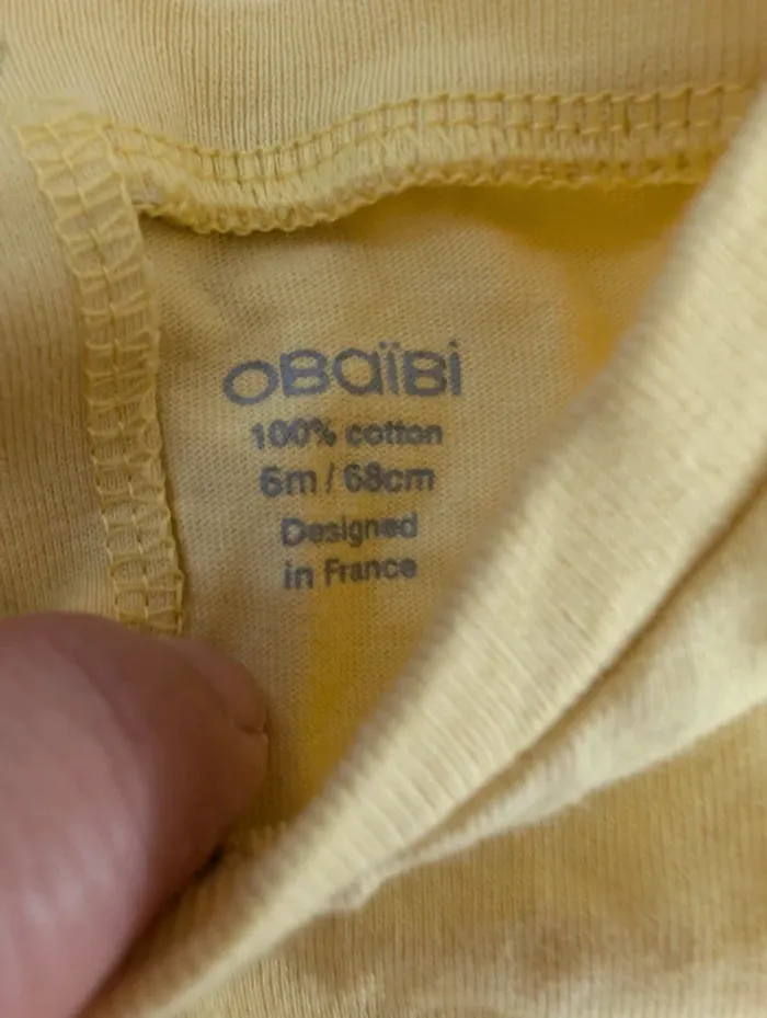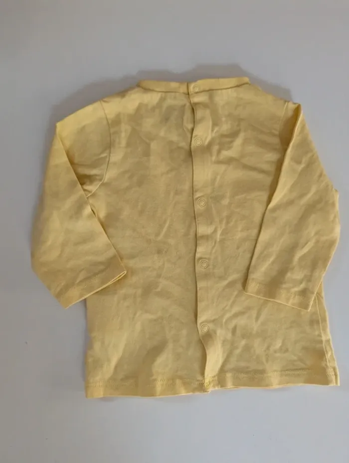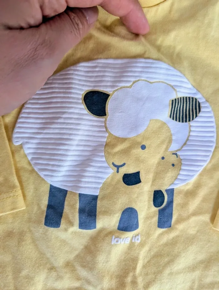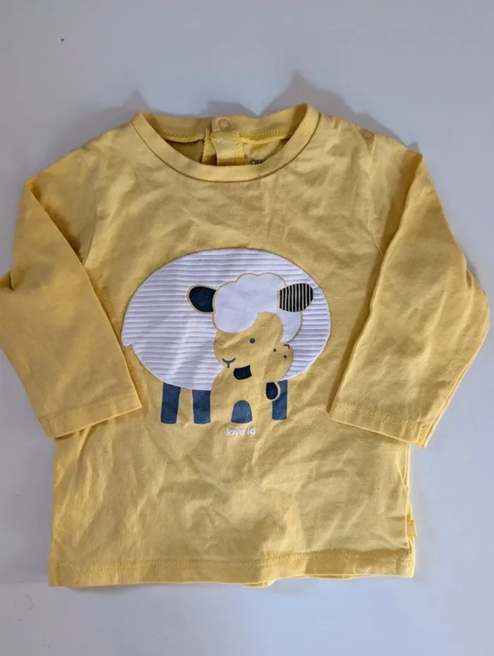 Je vends ce tee-shirt jaune manches longues de la marque Obaibi, avec un motif maman et bébé mouton en relief, pour bébé de 6 mois (68 cm).