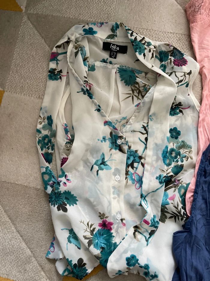 Rose Morgan (étiquette coupée) Blanc dentelle Morgan (étiquette coupée) Blanc et fleurs bleues Iska Bleu la mode est à vous, bretelles manquantes, jamais porté