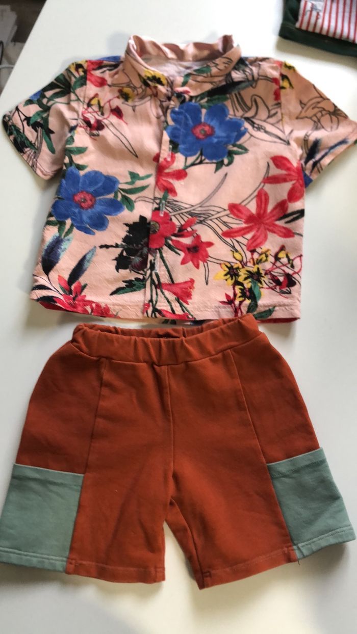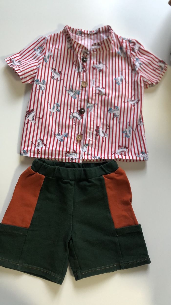 Lot comprenant trois short en sweat bouclette taille 18-24 , mon fils les porte depuis c’est un an et demi et rentre dedans à presque trois ans , les chemises sont de la même taille et mon fils rentre toujours dedans , je l’es ai cousu avec beaucoup d amour et j espère que ces tenues trouveront une seconde vie