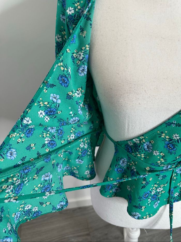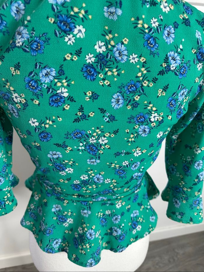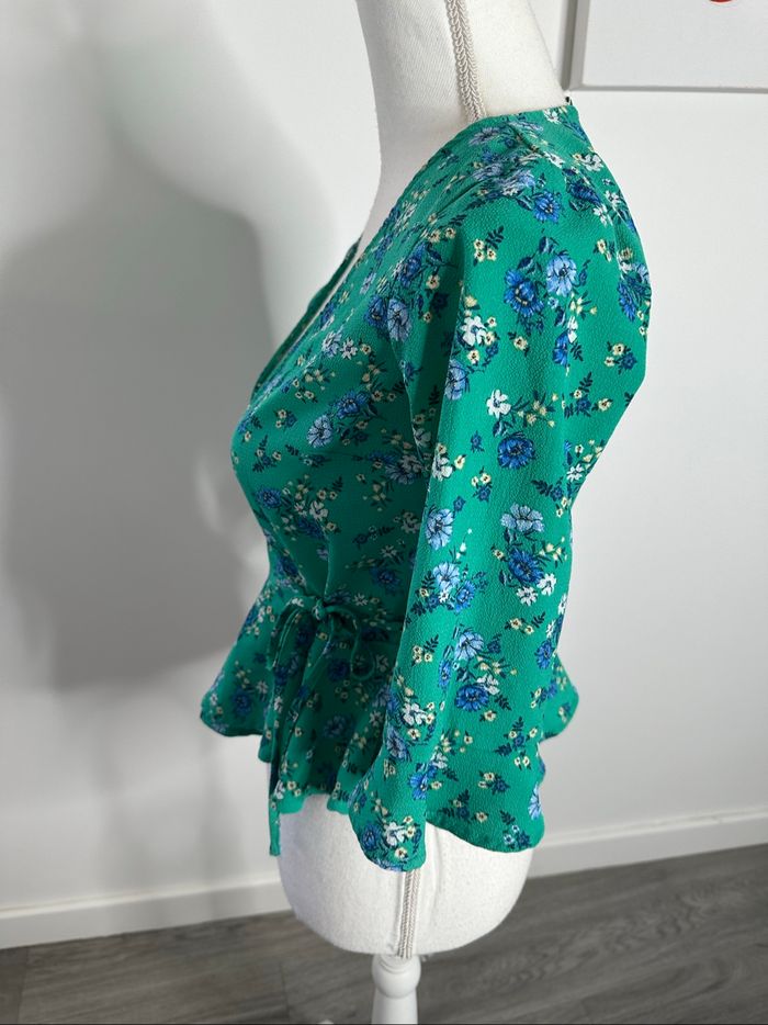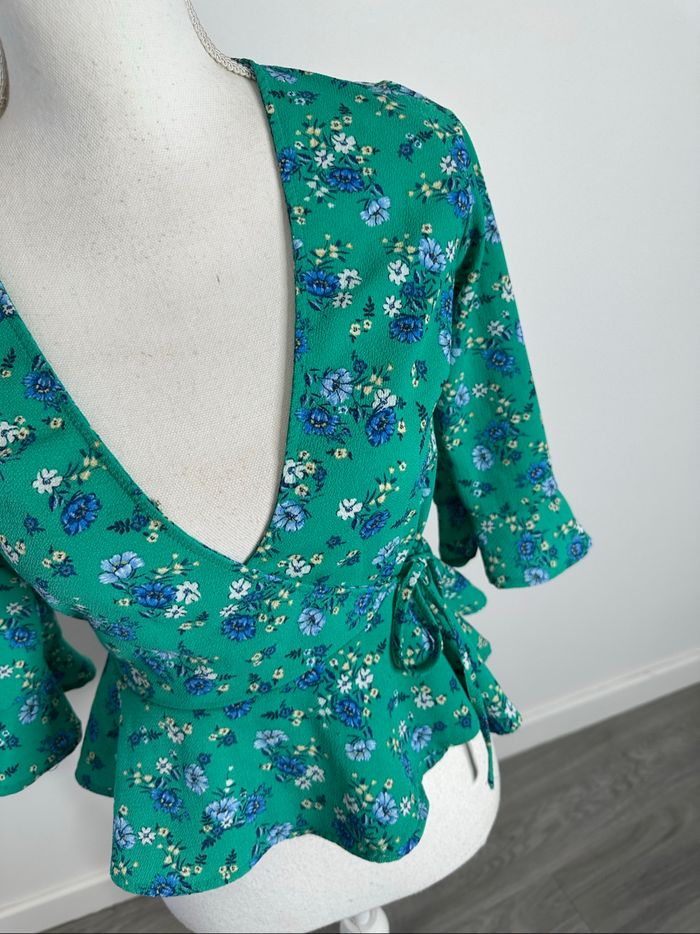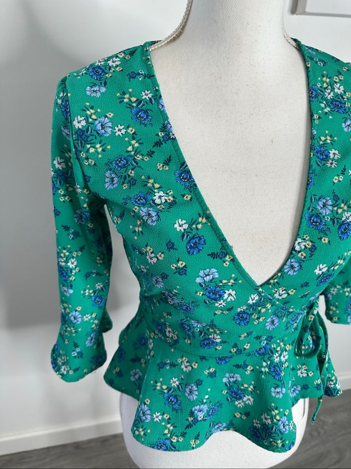Top péplum - Excellent état - Taille 34 équivalent XS Dimensions en bas de l’annonce - Marque H&M - Imprimés fleurs - Vert et bleu - Fermeture portefeuille - Polyester et élastane Dimensions: - 42cm niveau aisselles - 50cm de long