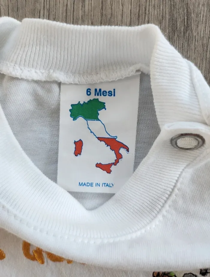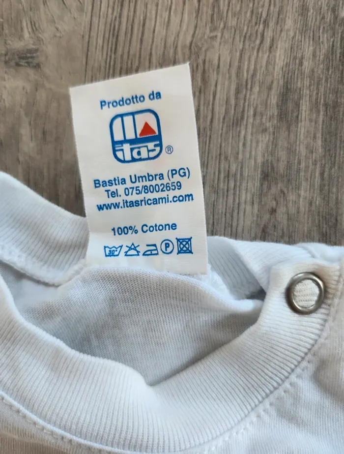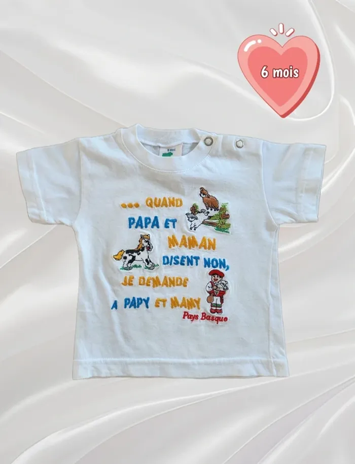 Vends T-shirt, taille 6 mois, avec fermeture boutons à pression à l'epaule, de couleur blanc avec message humoristique de plusieurs couleurs, d'une marque italienne inconnue, 100% coton. Remise en main propre possible ⚠️ Pas d'envoi par Vinted Go car aucun point dans ma région. Possibilité de faire des lots ☺️ Dressing trié par taille ⬇️ (et voir profil 💕) #Nebchan_garçon6mois