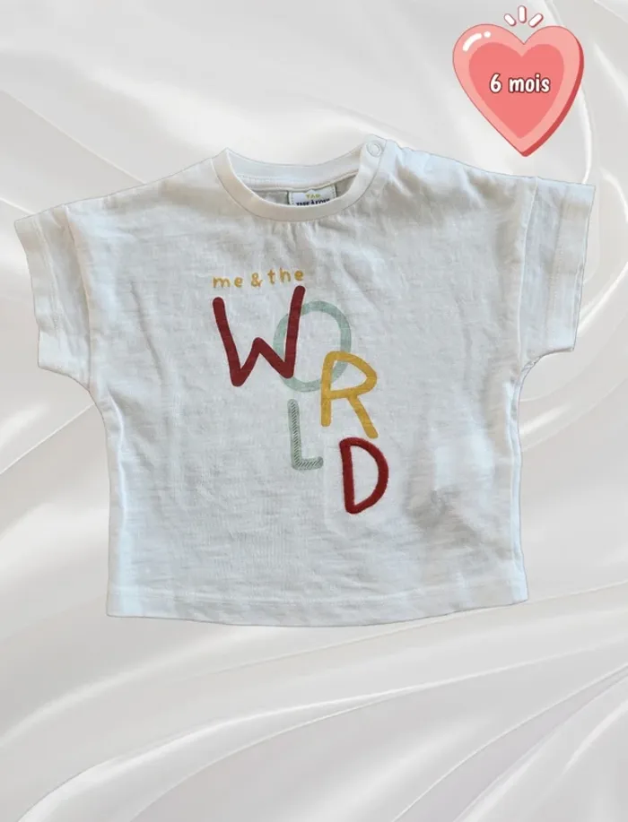 Vends T-shirt, taille 6 mois, de couleur blanc, avec inscription bordeaux, vert et jaune, de la marque Tape à l'oeil, 100% coton. Remise en main propre possible ⚠️ Pas d'envoi par Vinted Go car aucun point dans ma région. Possibilité de faire des lots ☺️ Dressing trié par taille ⬇️ (et voir profil 💕) #Nebchan_garçon6mois