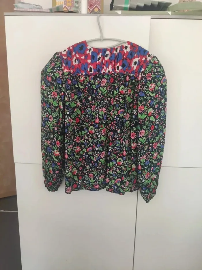 Très beau chemisier chemise blouse fleuri multicolore avec le haut du dos dans un autre imprimé. Les épaulettes font une carrure très structurée. Bas des manches élastiqué, col v, très bon état, taille M, marque Zara. Longueur 60 cm #vulariFemmesM38 #vulariZara