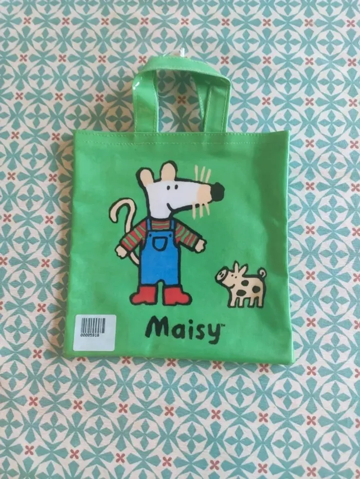 Joli petit sac avec un dessin de souris et un petit cochon. Dimension 19 cm x 27 cm avec les anses. il y a encore le cordon de l'étiquette. Il est neuf ! Marque anglaise Schreds Lincoln