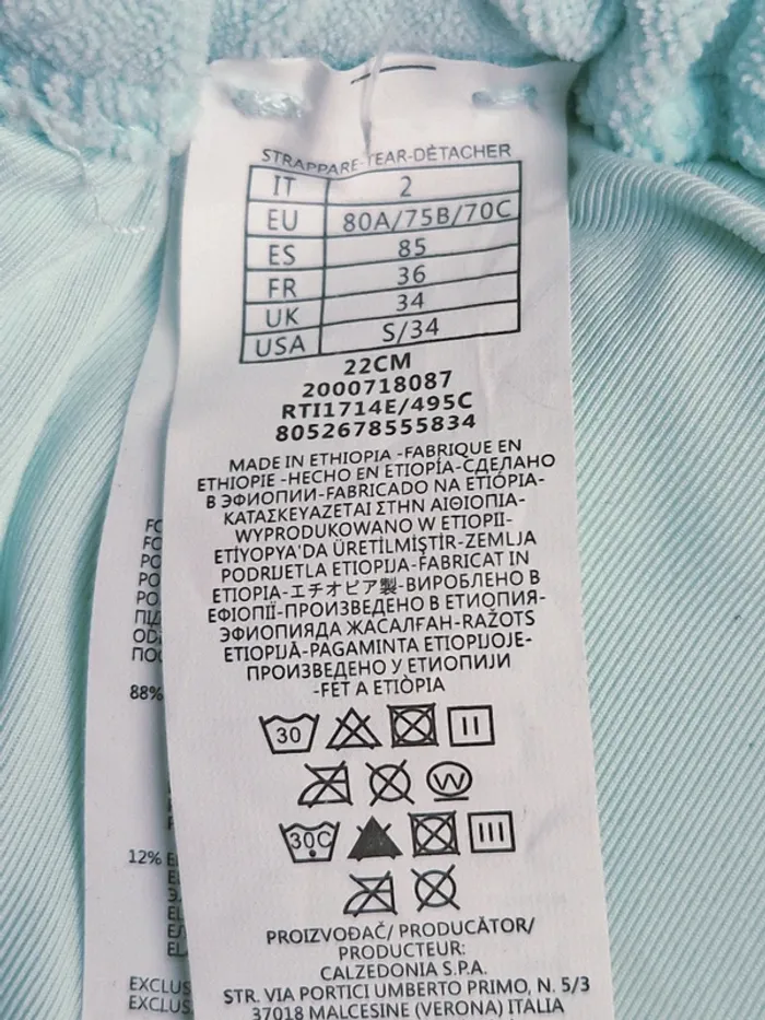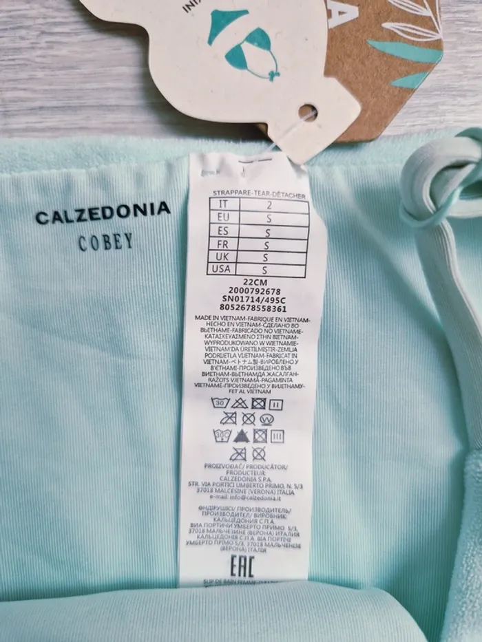 Maillot de bain bikini 2 pièces Calzedonia neuf avec étiquette #julilo7femme Haut rembourré forme de triangle : taille 85 Le rembourrage est amovible. Bas avec côté réglable : taille S Matière : effet éponge