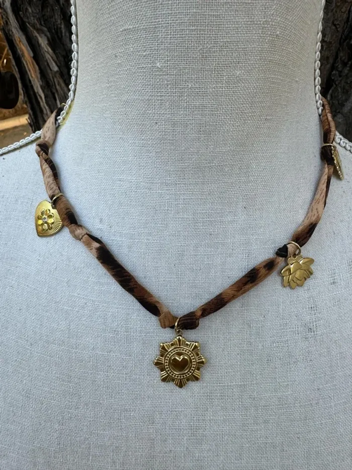 Collier foulard léopard breloques médailles coeur fleur  lotus