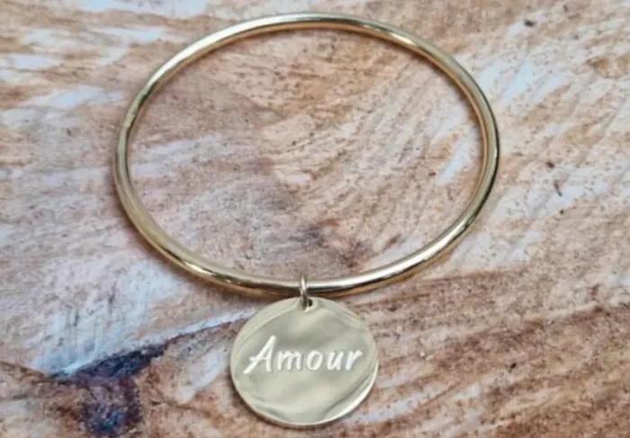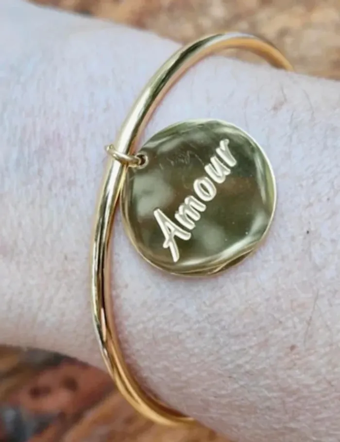 Bracelet jonc taille M 6,5 cm de diamètre médaille gravée amour acier inoxydable or Neuf dans pochon