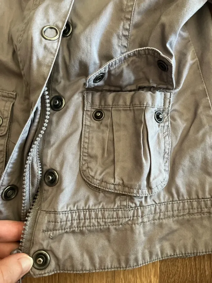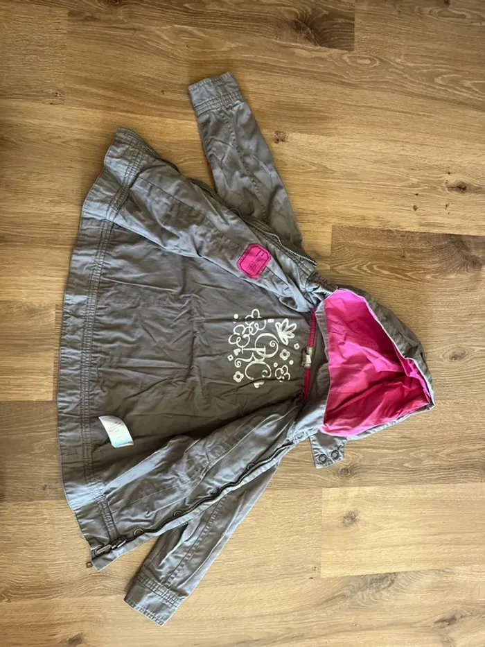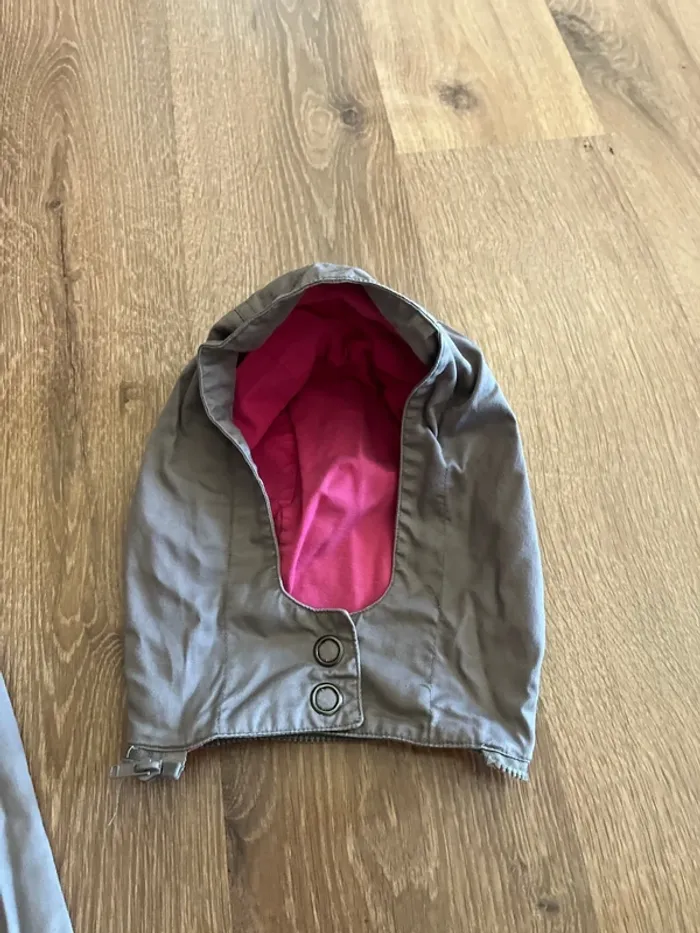 Très bon état général. Cependant l’intérieur rose de la capuche (amovible par une fermeture éclair) s’est un peu délavé avec le soleil. Avait au départ un sweat en doublure (qui explique une deuxième fermeture éclair) mais celui-ci a été perdu.
