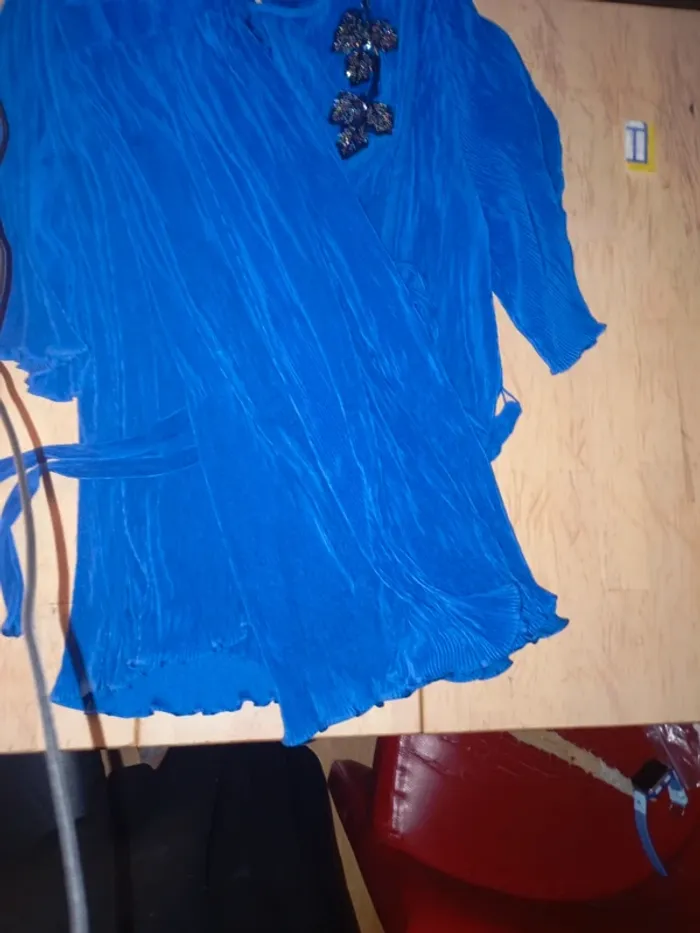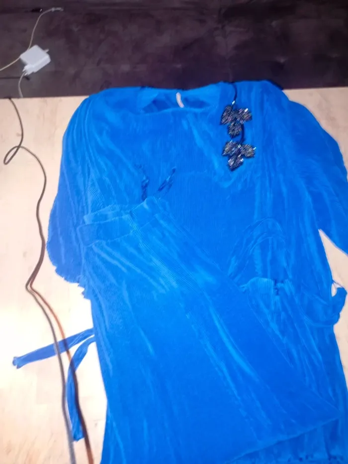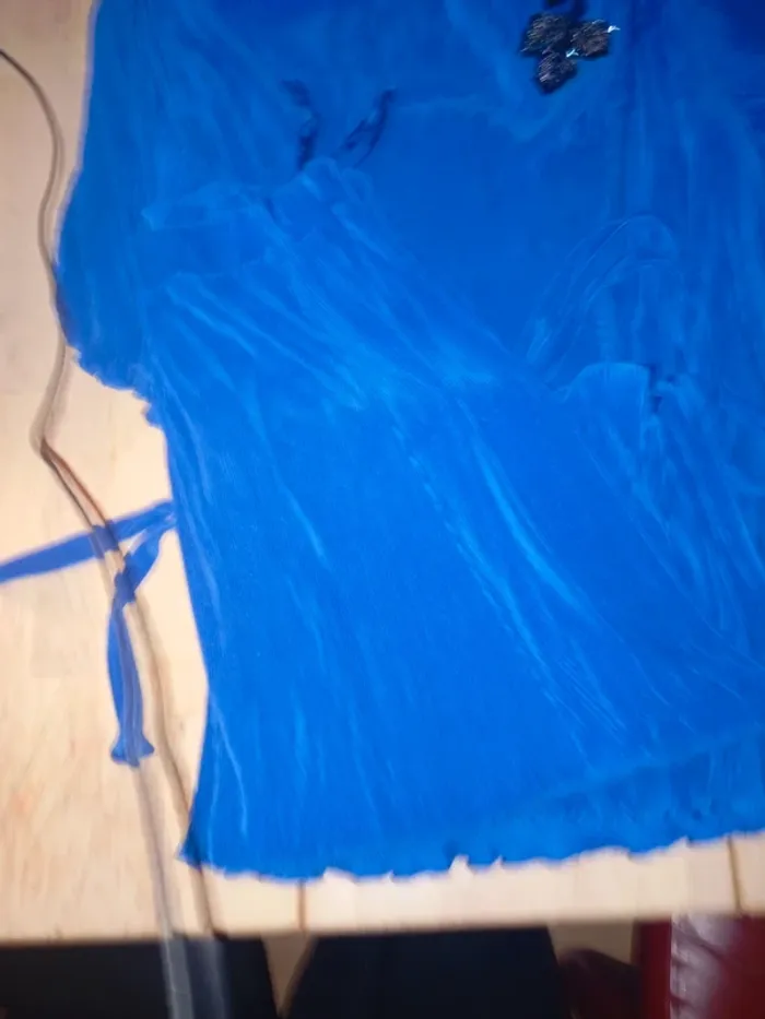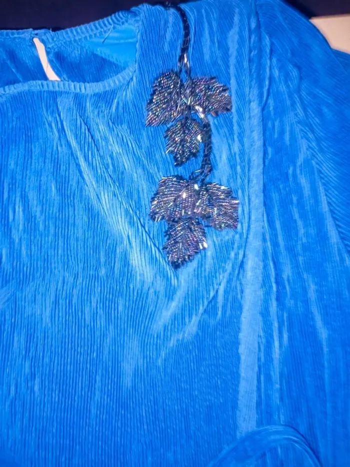 Blouse été jupe longue 74 cm de longueur Taille élastique bleu roi Perles broderie sur la poitrine Col rond Ceinture