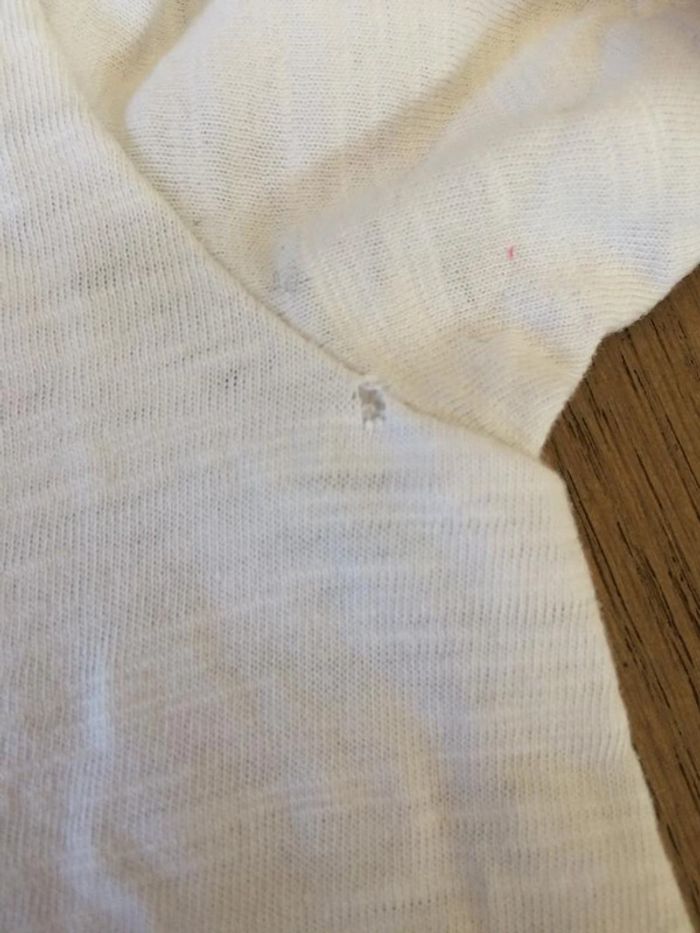 T-shirt blanc à motifs, taille 8 ans. Marque Okaidi. Etat satisfaisant car trous (photo 3), beaucoup porté. Envoi sous 24/48h maximum! ---------- (G.y) #tshirt8ans #palmier #été