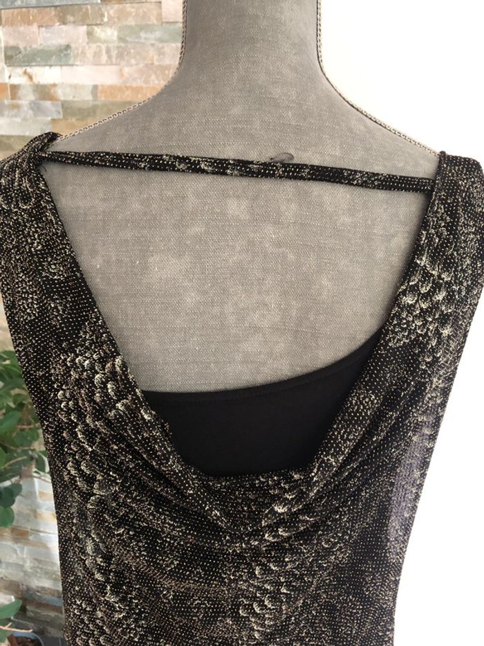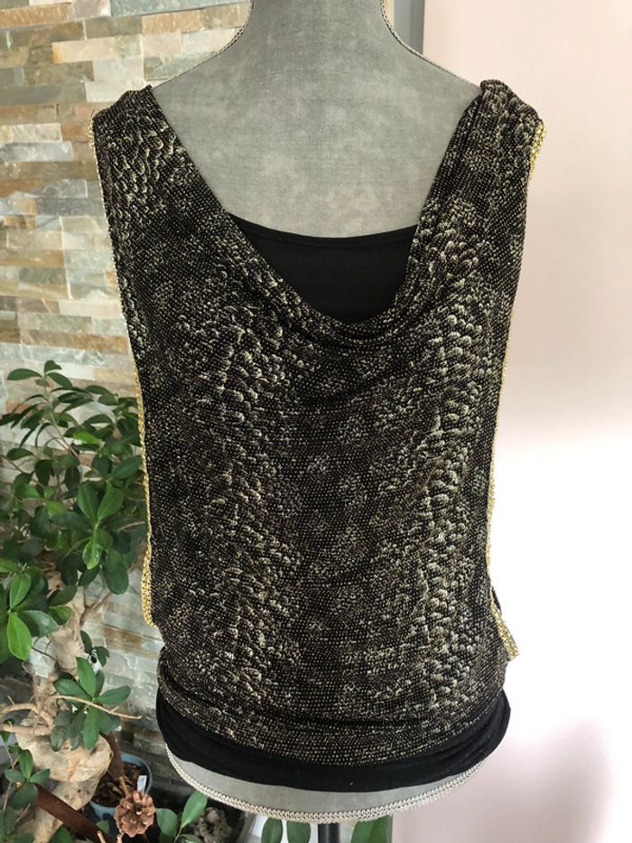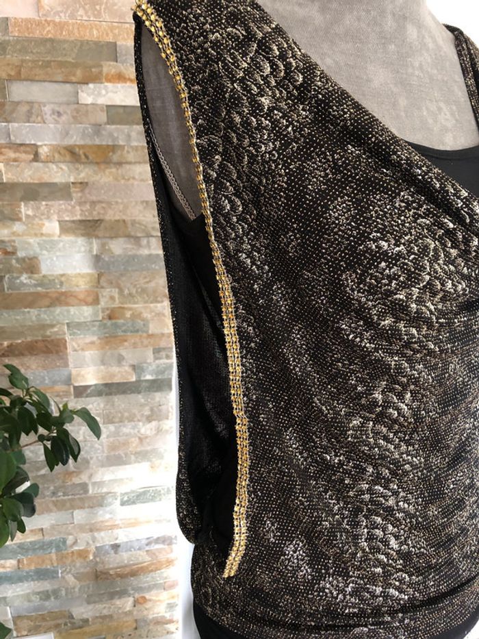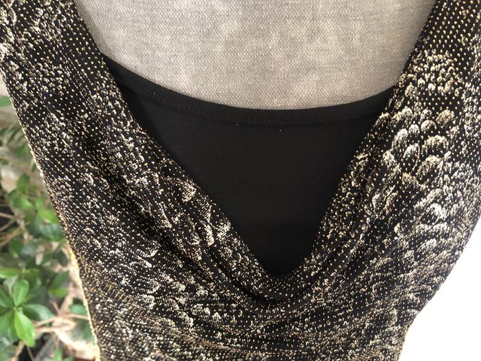 Haut long noir et doré sans étiquette mais correspon à un 38. Présence de bouloches sur la ceinture noire, elles 'enlèvent facilement. Bon état général, impossible de donner les mesures car le haut est fluide et élastique. 95% polyester, 5% elasthanne. Envoi sous 24/48h maximum! ---------- #hautlong38 #topcérémonie38 #fête #occasion #doré #vetement38minissa14
