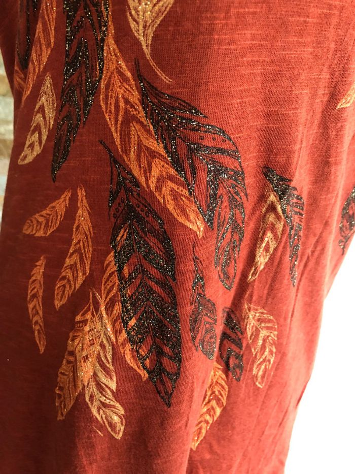 Débardeur rouille avec motifs plumes pailletées. Taille 1, marque Camaieu. Très bon état. - Aisselles: 43 cm - Longueur totale: 64 cm 50% viscose, 50% coton. Envoi sous 24/48 maximum ! ---------- #débardeur36 #camaieu36 #plumes #paillettes #été #rouille #vetement36minissa14