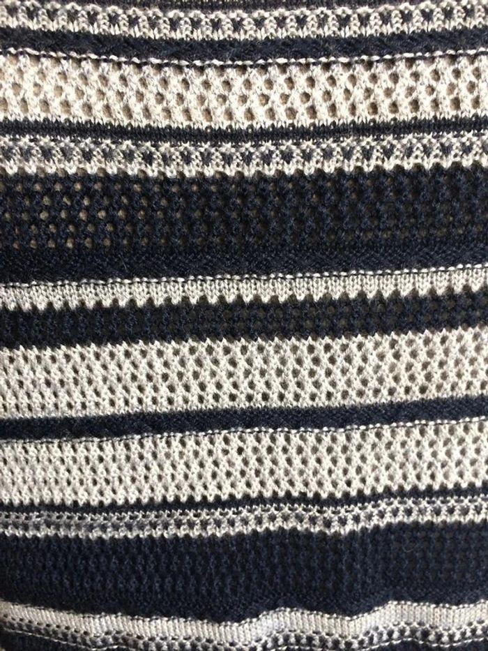 Pull ajouré dans les tons bleu et blanc, manches 3/4. Plus d'étiquette mais correspond à un 38/40, voici les mesures : - Aisselles : 46 cm - Longueur : 64 cm Matière extensible, très bon état. #pullajouré38 #pullajouré40 #pullrayé3840 #vetement38minissa14 #vetement40minissa14