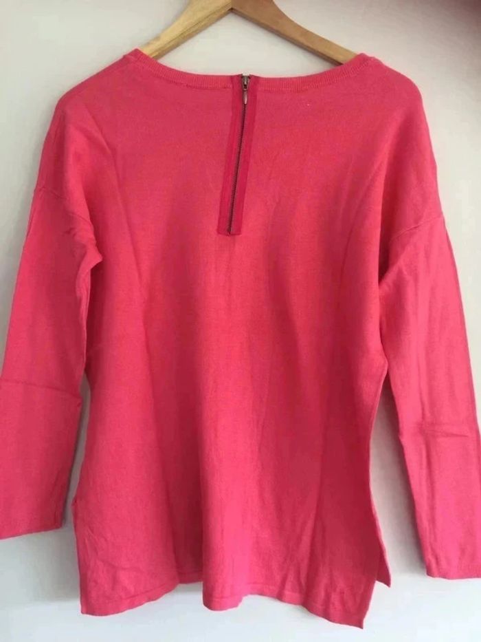 Pull rose bonbon en très bon état. Étiquette visible donc coupée mais correspond à un 38. Effet un peu loose. Fermeture dans le dos. Marque Camaïeu #pullrosecamaieu #pullrose38 #vetement38minissa14