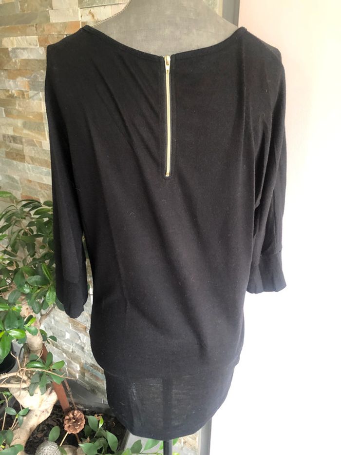 Pull fin noir, manches 3/4 de chez kiabi. Taille S (34/36). Pull fin, légèrement transparent, fermeture éclair dorée dans le dos. Bon état général, porté plusieurs fois (présence de petites bouloches (photo 3)). Plus long derrière que devant. #pullfin36 #pullfinkiabi36 #pullkiabi36 #vetement36minissa14