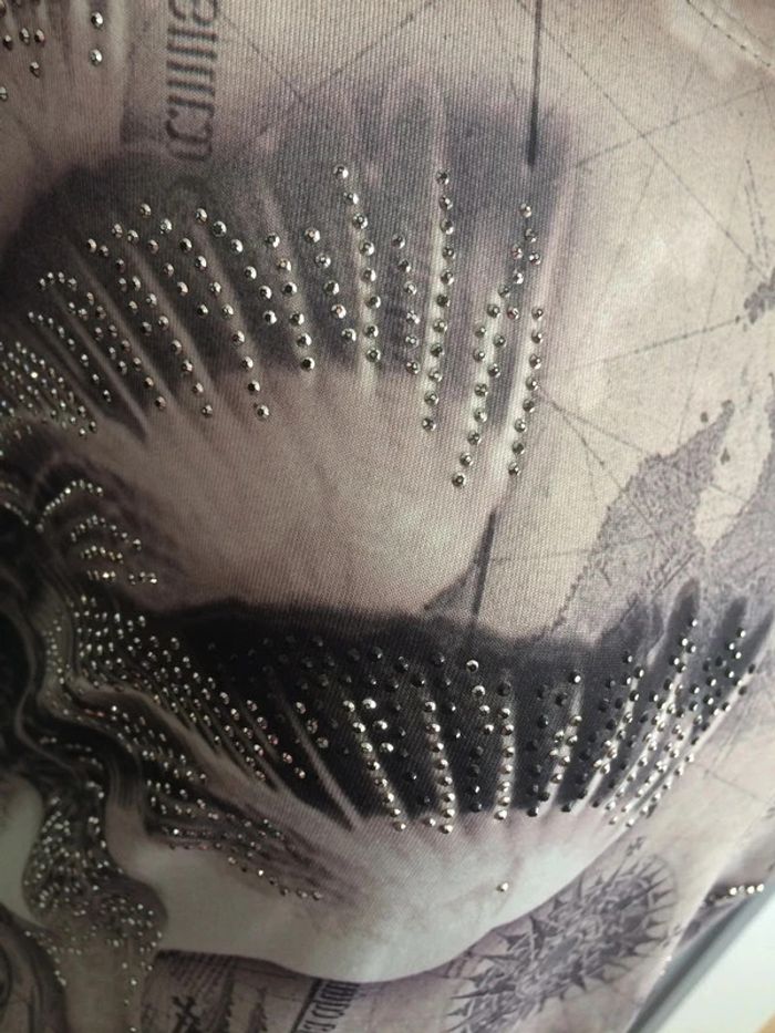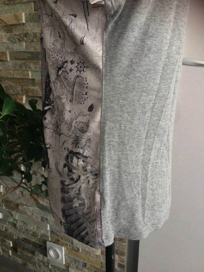 T-shirt gris à motifs avec strass. (manque quelques strass mais ne se voit pas dans la globalité) Plus d'étiquette de taille mais correspond à un 38. - Aisselles: 45cm - Longueur totale: 63 cm #tshirtcanard #tshirtstrass38 #vetement38minissa14