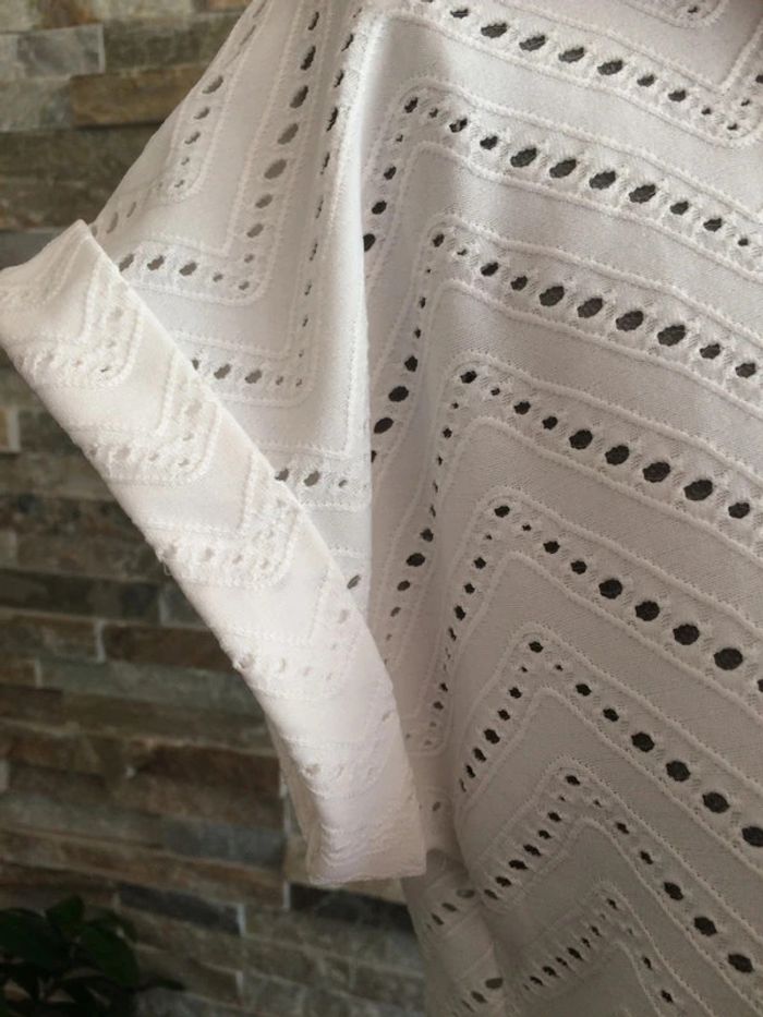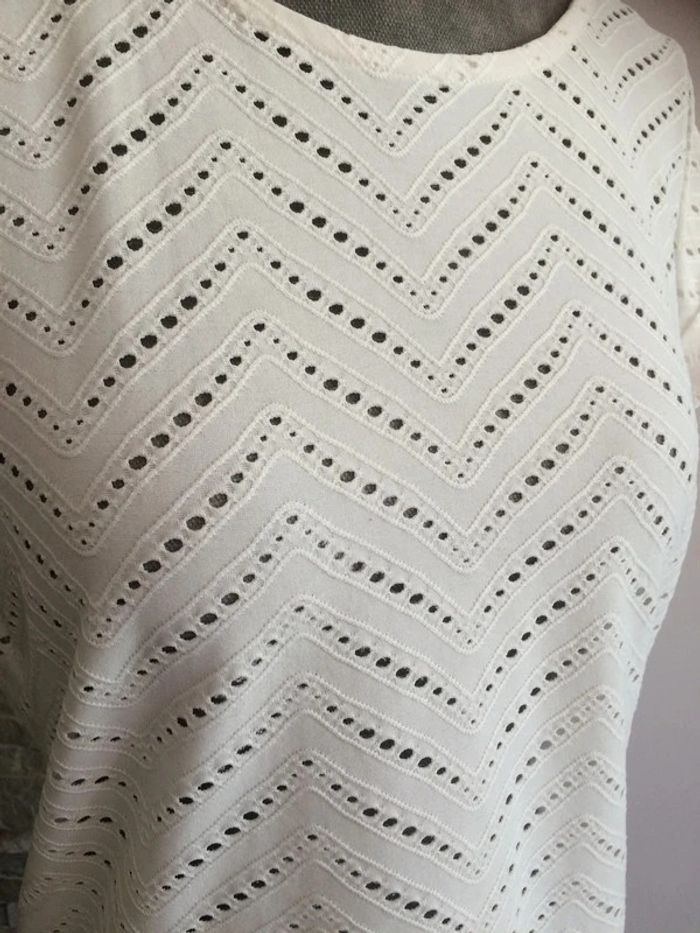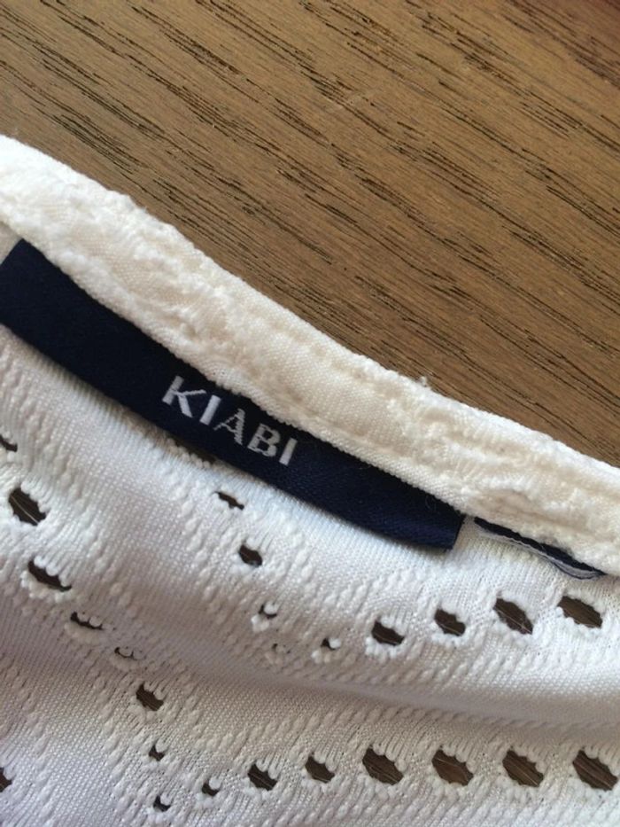 T-shirt blanc ajouré, marque Kiabi. En bon état, étiquette coupée, correspond à un 38. - Longueur totale : 57cm Pas possible de donner d'autres mesures car aucune couture (ni aux épaules ni aux aisselles). #tshirtblanc38 #tshirt38 #kiabi38 #vetement38minissa14
