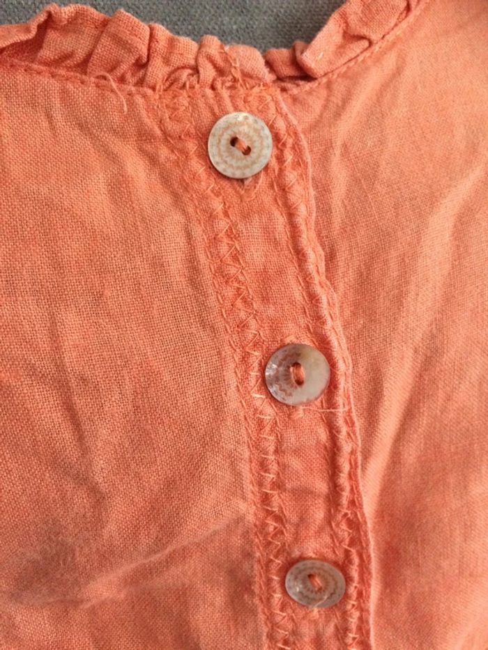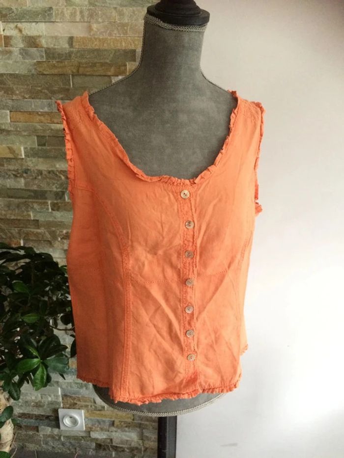 Débardeur orange en lin, taille 42. Bon état général malgré le fait qu'il ai été pas mal porté. 100 % lin, un bouton supplémentaire disponible sur l'étiquette. - Aisselles: 53 cm - Longueur totale: 52 cm environ. #débardeurorange42 #débardeurlin42 #lin42 #promod42 #débardeurpatricebréal42 #vetement42minissa14