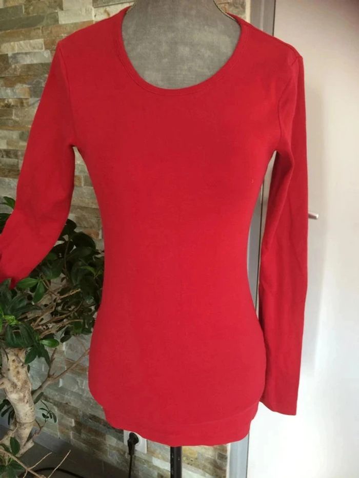 T-shirt à manches longues rouge de belle qualité. Taille S, en bon état général. J'ai effectué deux réparations, la première sur la couture d'un côté (photo 3) et une couture sur l'ourlet du bas car le fil était cassé. Marque LOGG. - Epaules: 35 cm - Aisselles : 38 cm - Longueur: 65 cm #tshirtrouge36 #tshirtmancheslonguesrouge36 #hautlogg36 #vetement36minissa14