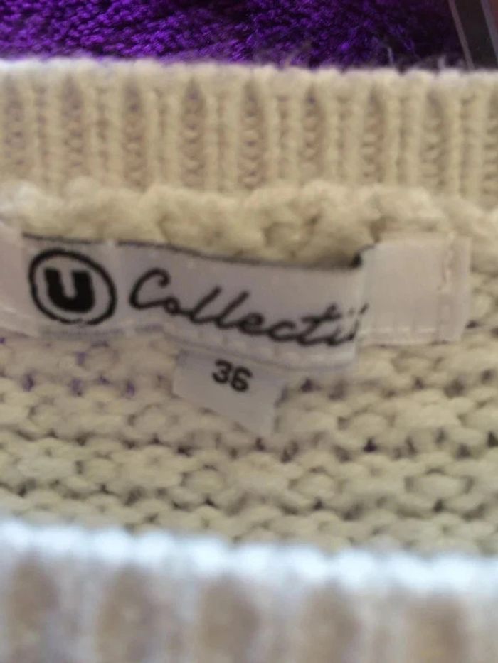 Pull blanc avec inscriptions grises, taille 36. Marque U collection. Bon état, quelques bouloches. #pullblanc36 #pull36 #vetement36minissa14