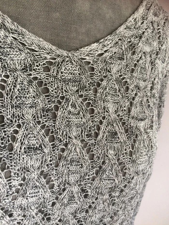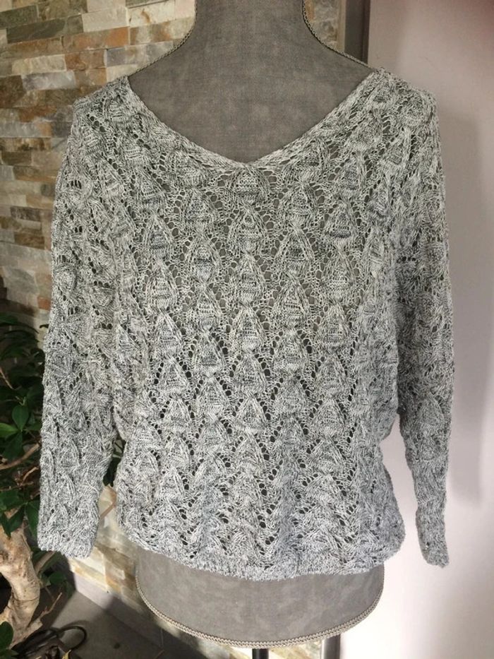 Pull très fin et ajouré à col V. Fil noir et blanc, manches 3/4. Bon état général, quelques fils tirés... Plus d'étiquette car trop visible mais correspond à un 36. - Longueur totale: 53 cm environ #pullfin36 #pullajouré36 #vetement36minissa14