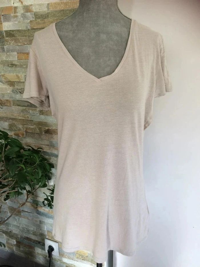 T-shirt col V beige de la marque Best Mountain. Taille 2, bon état général (une tâche dans le bas du t-shirt visible sur la photo 2), t-shirt légèrement bouloché car porté... - Epaules: 43 cm - Longueur: 70 cm environ - Aisselles: 47 cm #tshirtbestmountain38 #bestmountain38 #tshirtbeige38 #vetement38minissa14
