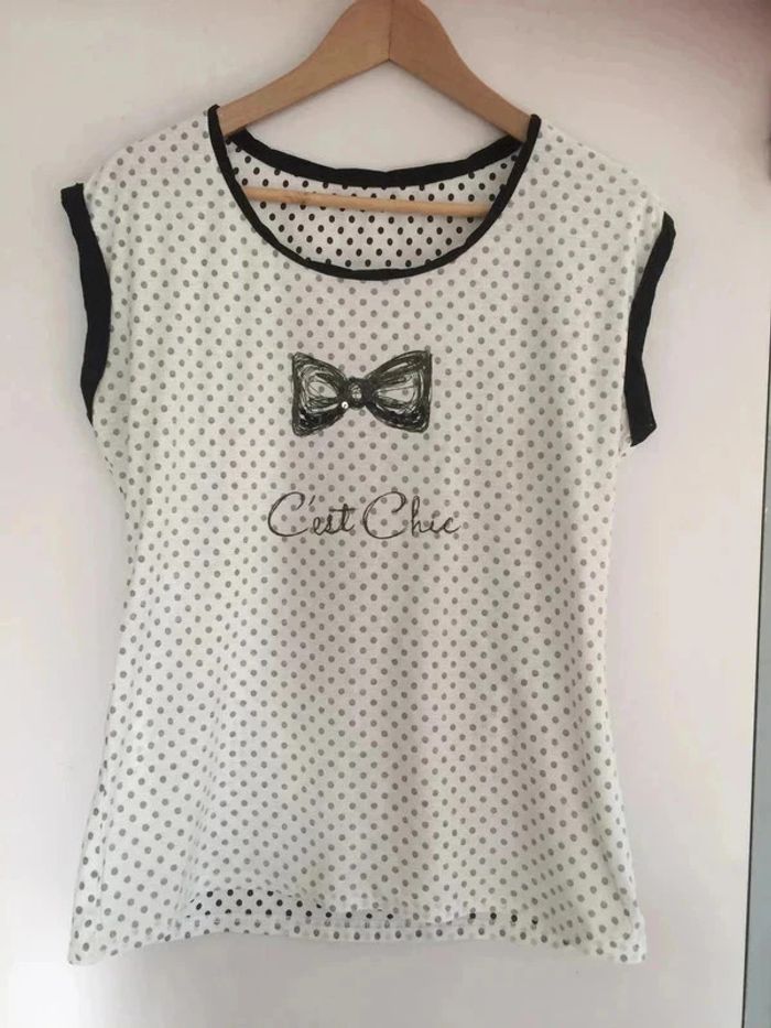T-shirt à pois noir et blanc, taille 38/40 (n'a plus d'étiquette car trop visible) Pas mal porté, encore en bon état. Sequins cousus sur le noeud. #tshirtpois38 #tshirtpois40 #vetement38minissa14 #vetement40minissa14