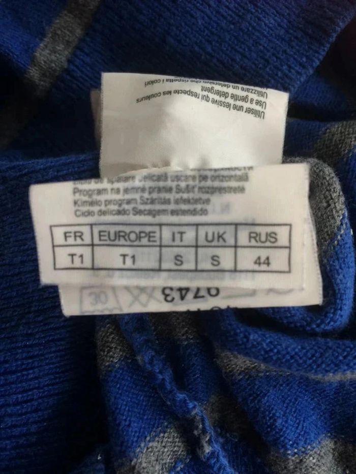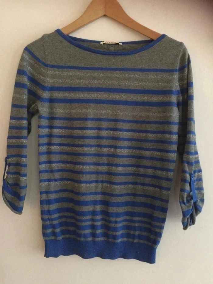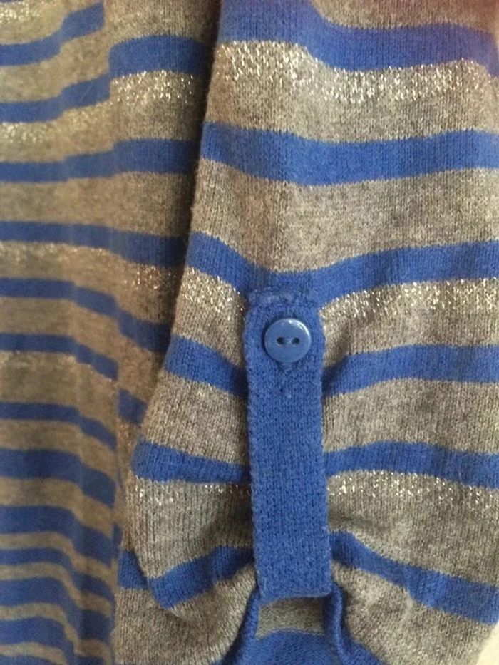 Pull gris, manches 3/4 a relever à l'aide d'un bouton. Gris, argenté et bleu. Pas mal porté mais encore en bon état. Taille 36, marque Camaieu. #pullcamaieu36 #camaieu36 #pullrayé36 #vetement36minissa14