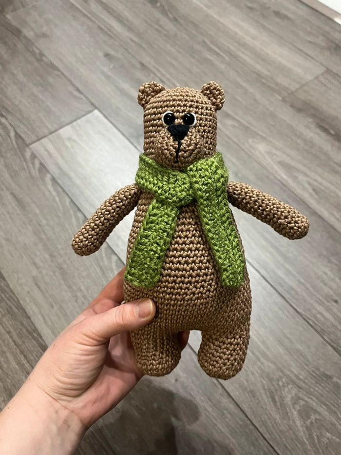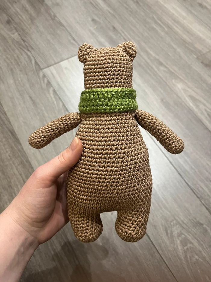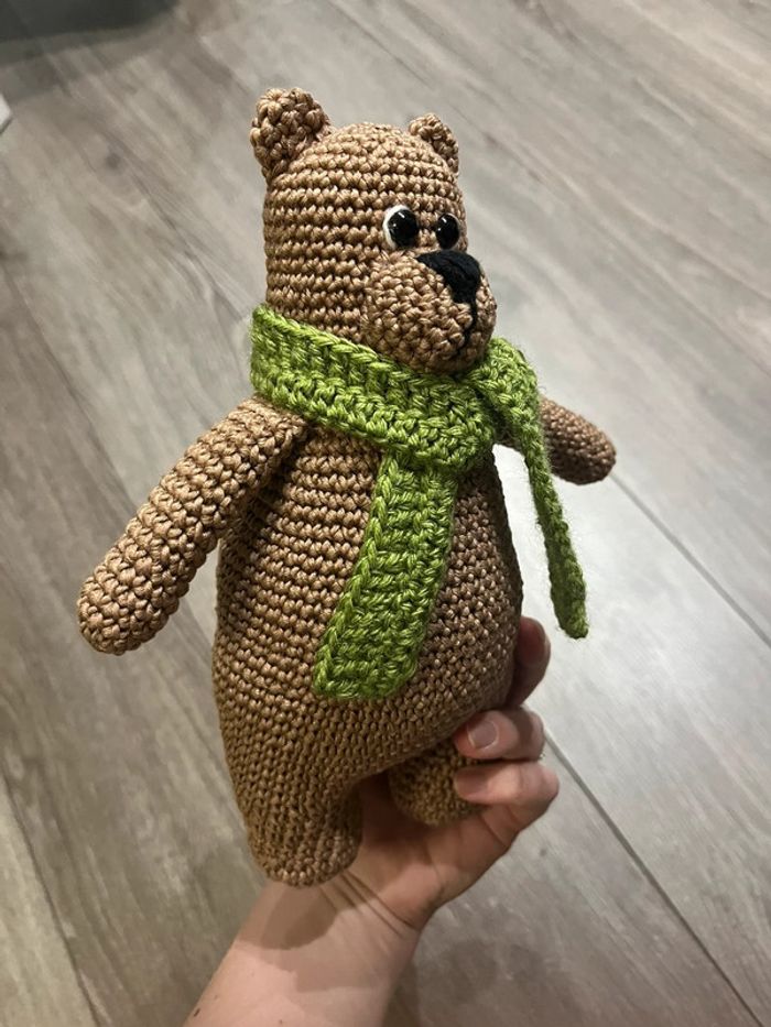 Ours brun fait main avec soin et l’amour. Fil 100% coton, écharpe s’enlève et tricoté en acrylique. Pièce unique !
