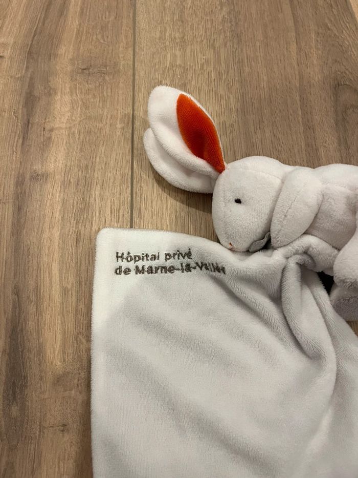 Doudou lapin blanc doudou et compagnie !!!! Il est brodé à l’hôpital Marne la vallée voir dernière photo !!!!!