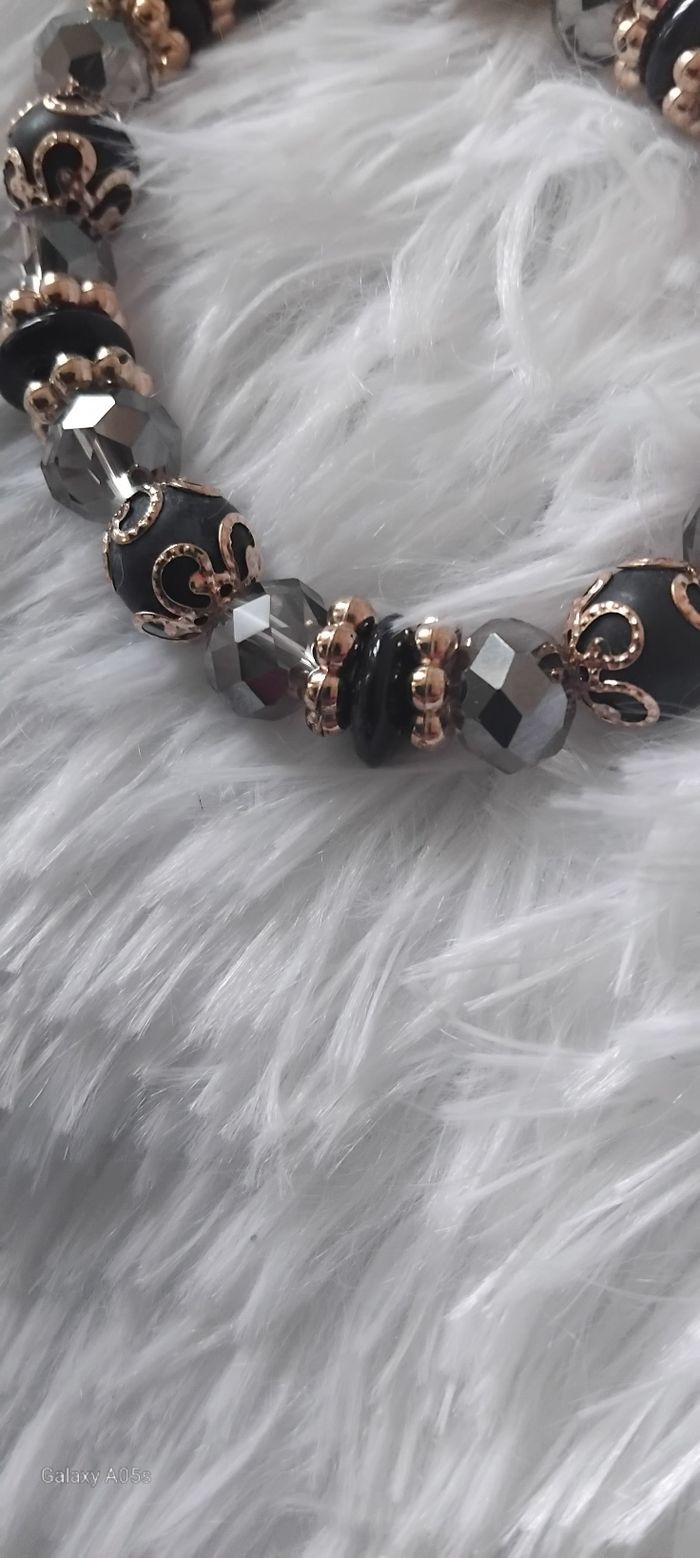 Lot de 2 bracelets 1 avec perles noires et pierres volcaniques et dorures 1 avec perles transparentes et perles noires avec motifs dorures Bracelet élastique résistant Diamètre bracelet : 7 cm