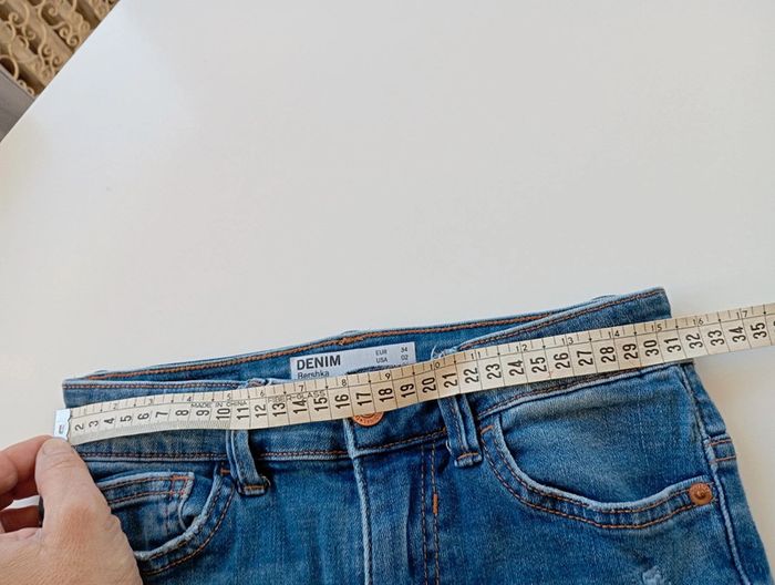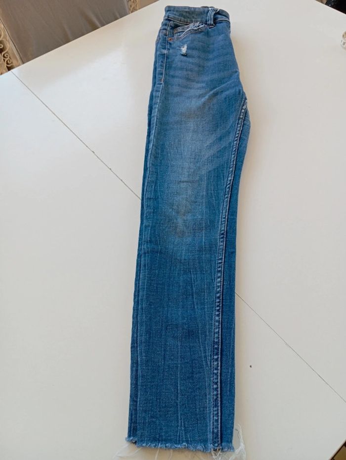Jean Bershka taille haute se porte court aux jambes bon état taille 34 les déchirures sont faites exprès les tailles au niveau de la taille et de la longueur sont indiquées avec un mètre