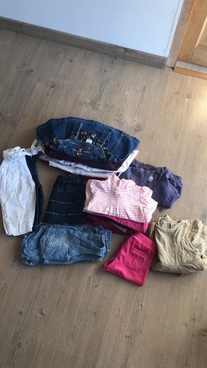 Lot de vêtements taille 6 mois : 3 pantalons 1 bas de jogging 1 jupe 8 robes 1 imperméable 7 tee-shirts manches longues 1 gilet sans manches