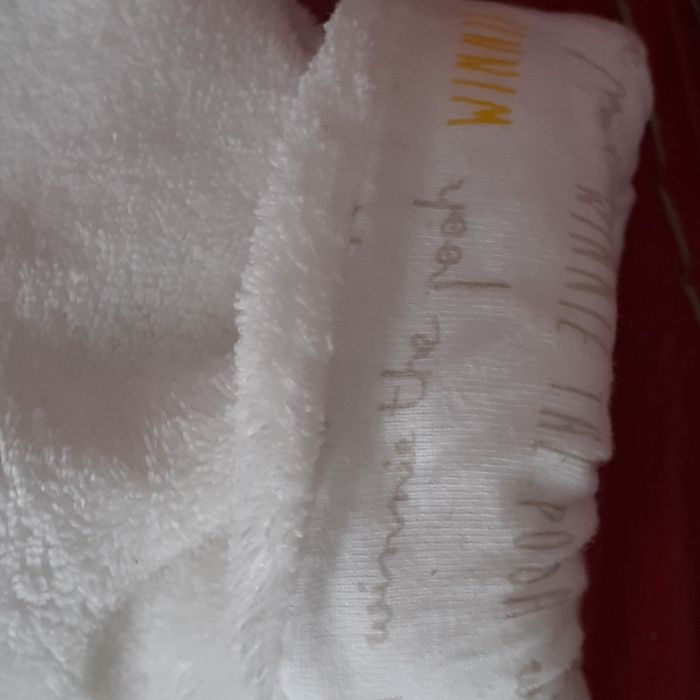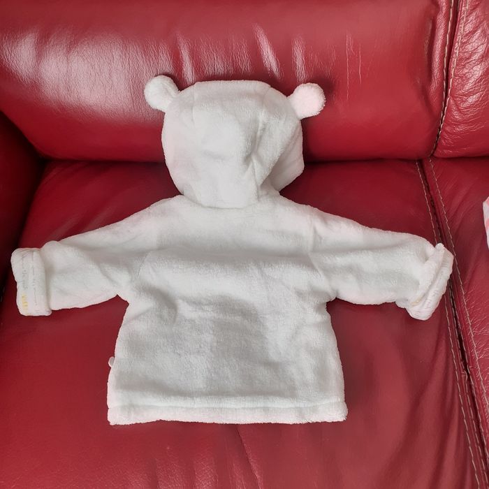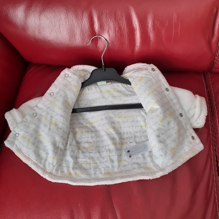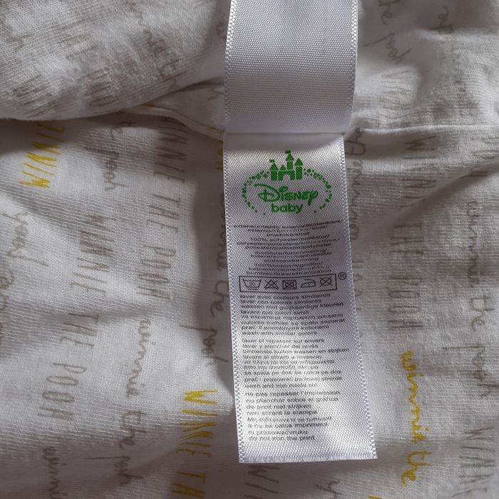 Veste polaire avec capuche; taille 1/3 mois; marque Disney Baby. Motif "Winnie l'ourson" devant; fermeture devant par boutons-pression métalliques. Coloris blanc cassé. Étiquette intérieure pour inscrire les coordonnées. Tissu intérieur imprimé avec inscriptions " Winnie the Pooh". Lavable à 30° // voir photos pour détails