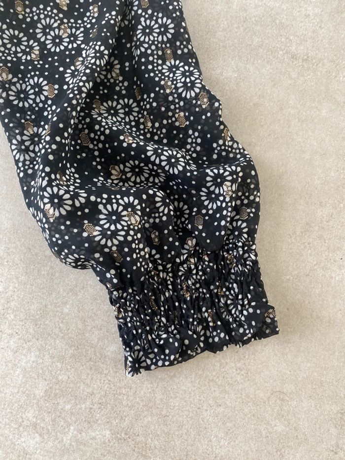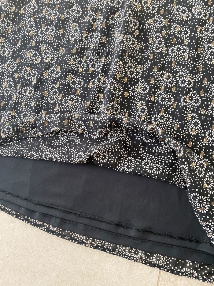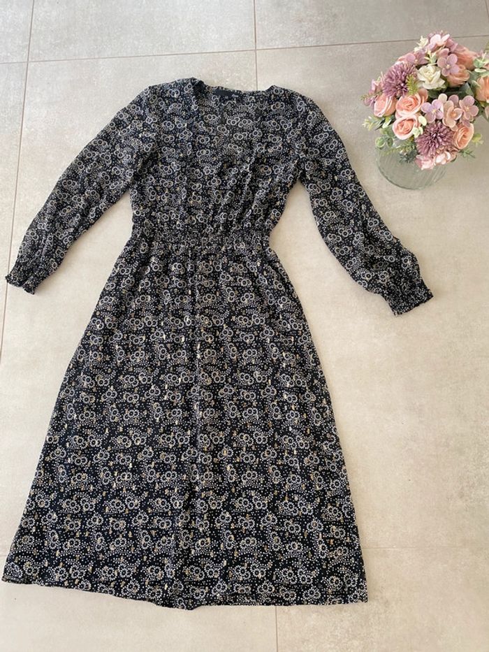 Tissus mousseline légèr et agréable à porter Mi -longue ( arrive au mollets ) Avec petits imprimés doré La robe est doublée Taille 40 envoi possible avec tous les transporteurs dont Vinted go #tendance #printemps #confortable #confort #élastique #extansible #zara #mango #primark