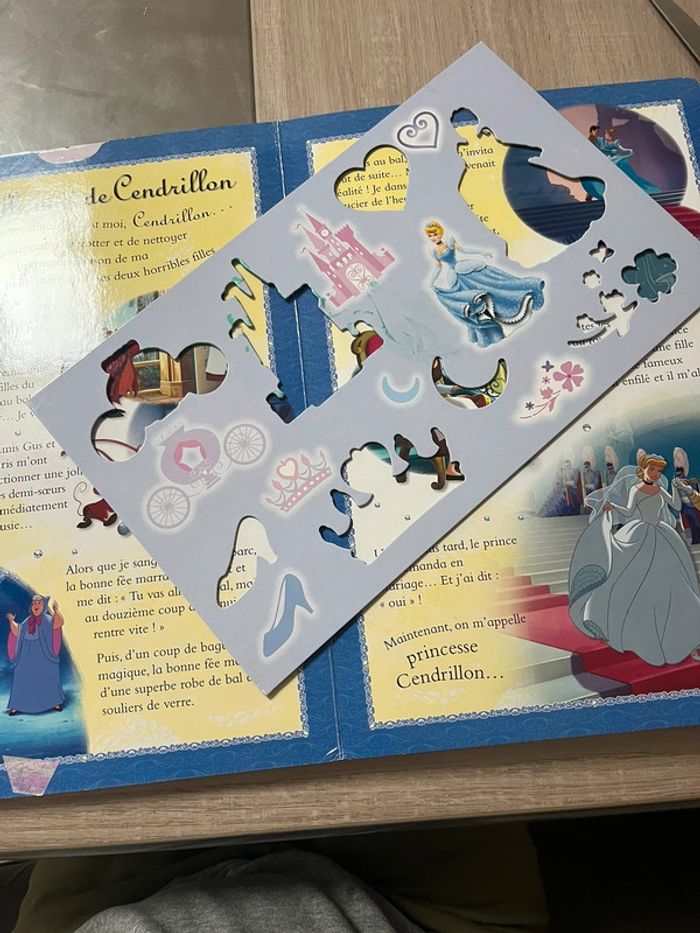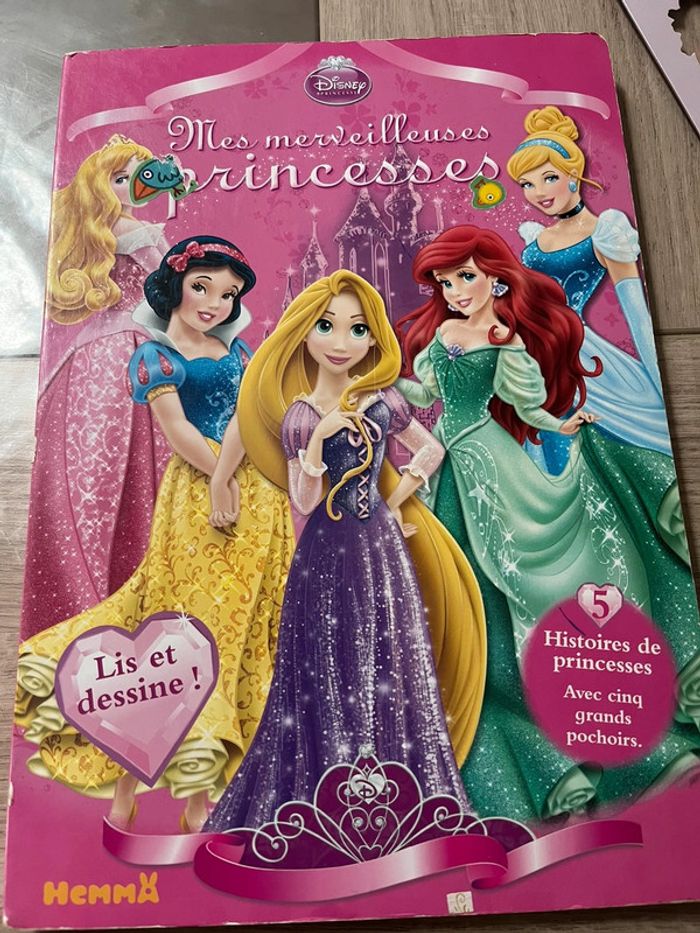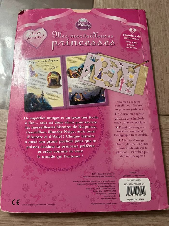 Livre avec 5 pochoirs princesses Disney, tbe (un coin du livre un peu plié mais ne gêne en rien, voir photo) (peux neuf 15,95€), d’autres livres disponibles dans mon dressing