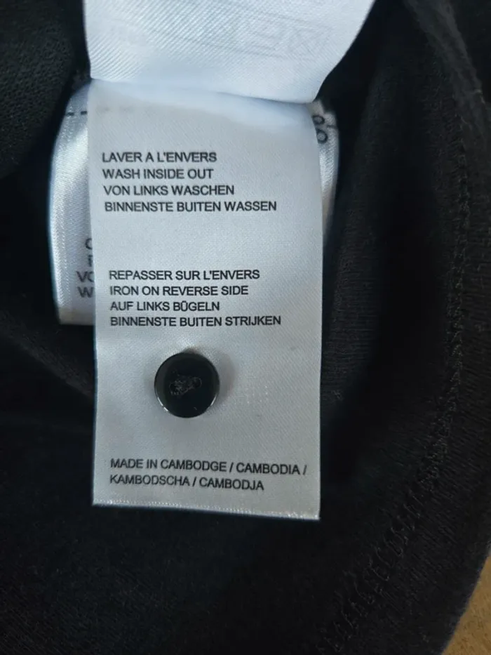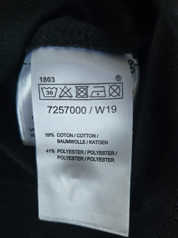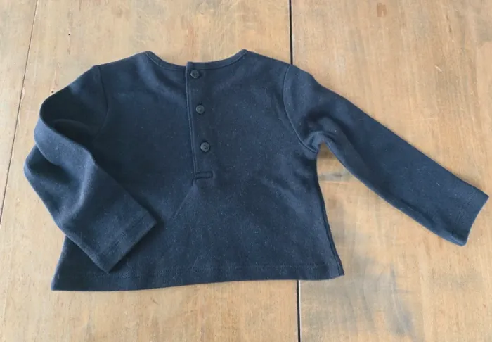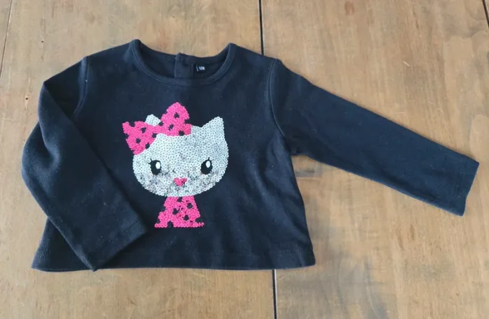Tee-shirt noir, déco chat, manches longues pour fille 12 mois. Fermeture haut du dis 3 boutons. 1 bouton en plus sur l’étiquette.
