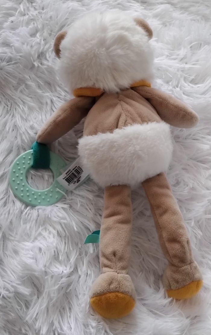 Doudou peluche d activités lion Maxou en velours de couleur beige et en velours fourrure de couleur blanc Col autour de son cou en velours de couleur orange Attaché à sa main un anneau de dentition Bruit de hochet dans la tête Bruit de pouet pouet dans son ventre
