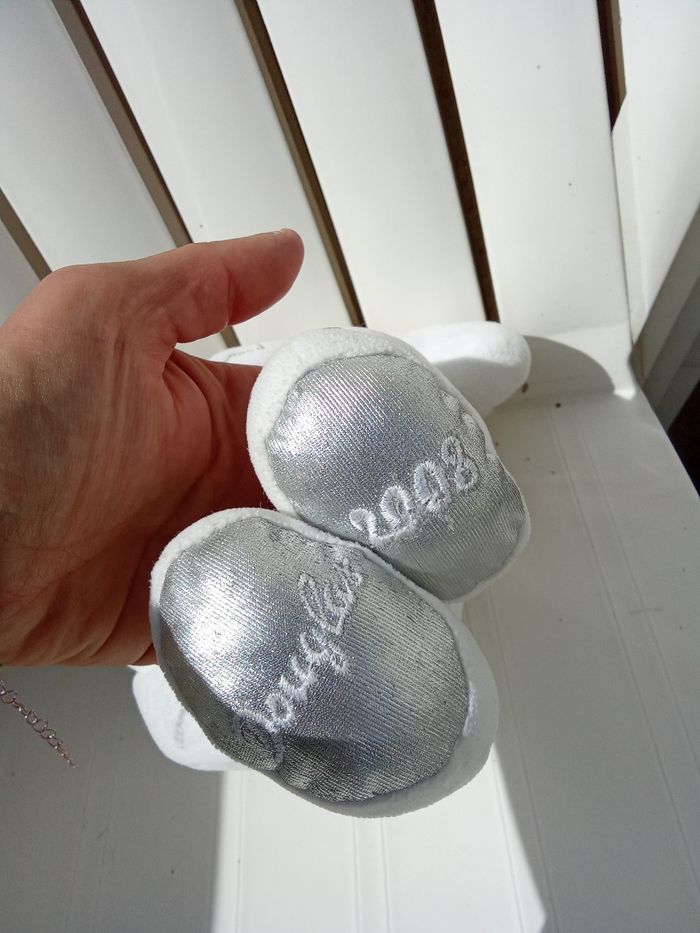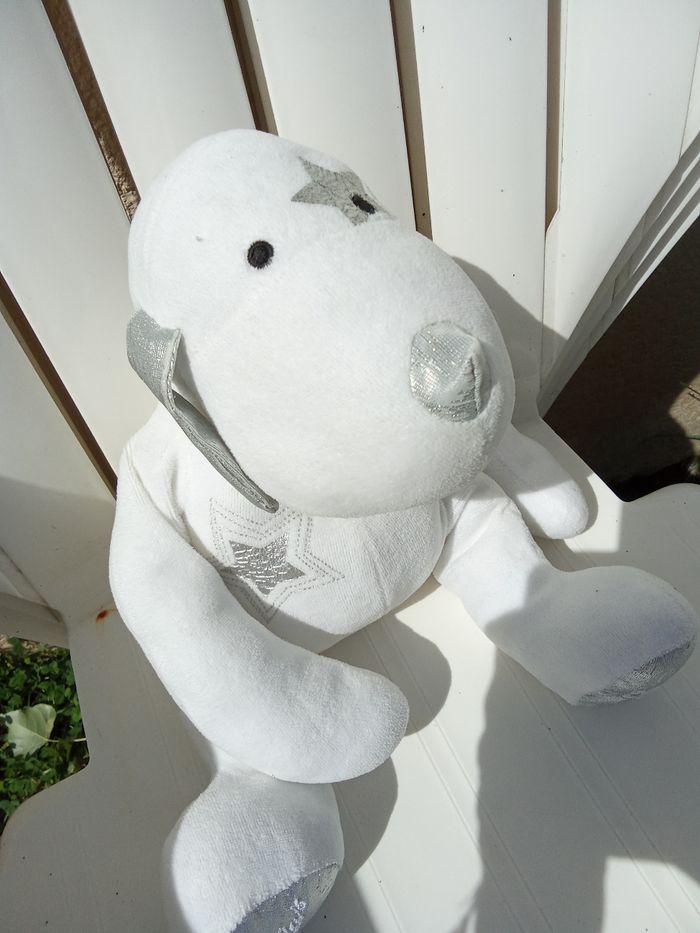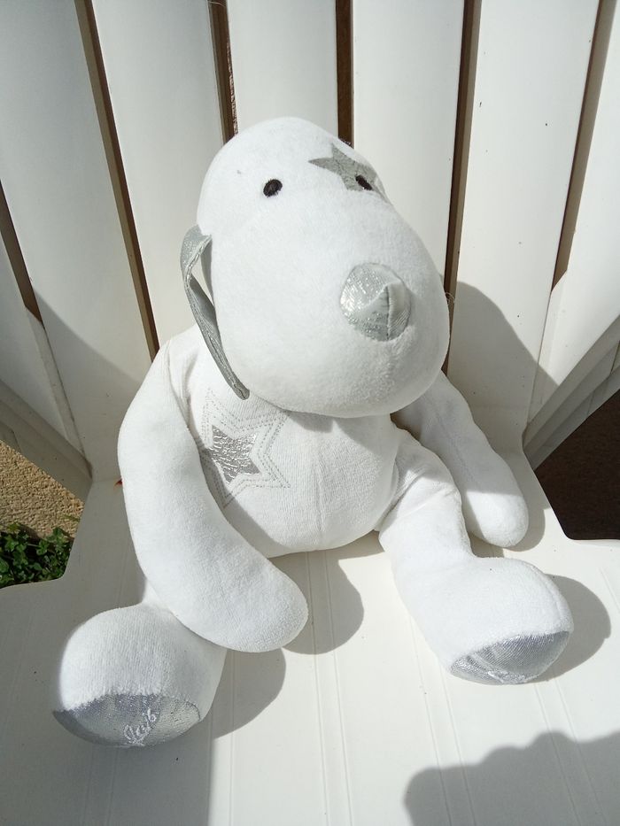 Doudou chien blanc et argent étoiles brodées ainsi que douglas et 2008 sous les pattes. Aucune étiquette. Bon état général De nombreux autres doudous enfant également à vendre ds mon dressing et réduction activée
