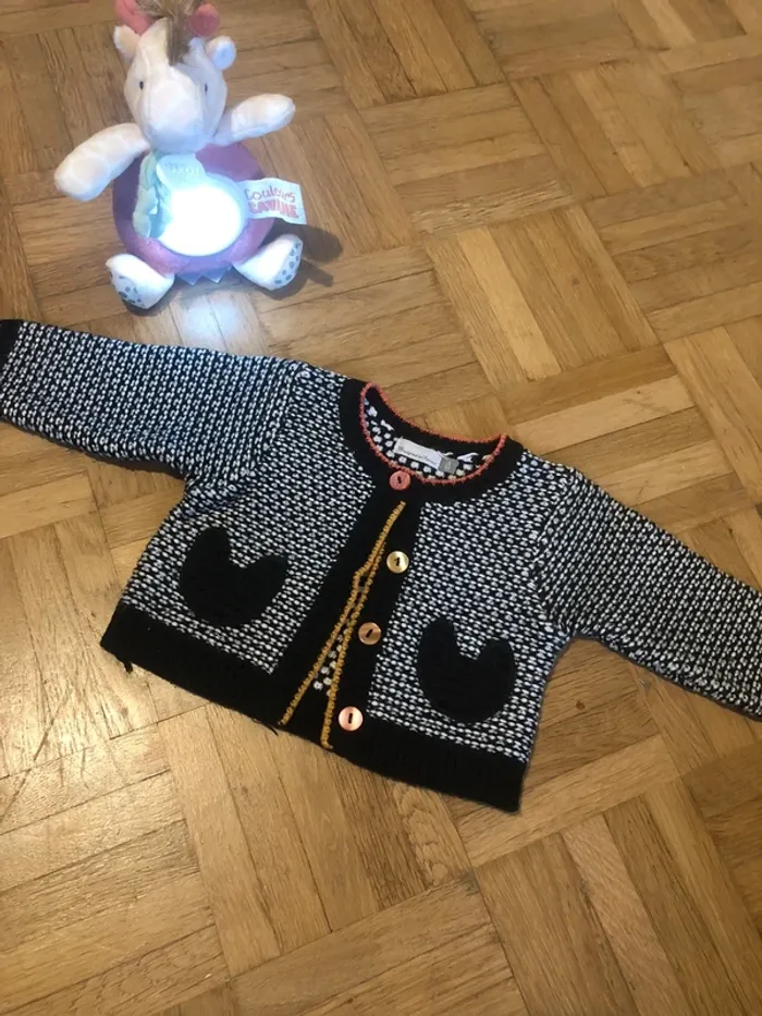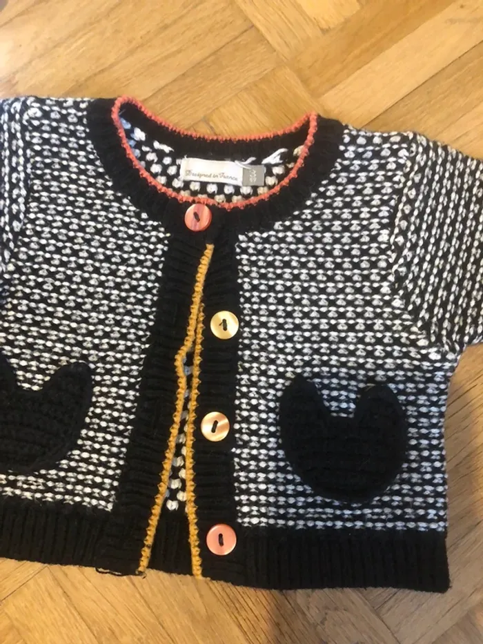 Gros gilet chiné noire et blanc , fausse poche chat Très bon état 3 mois