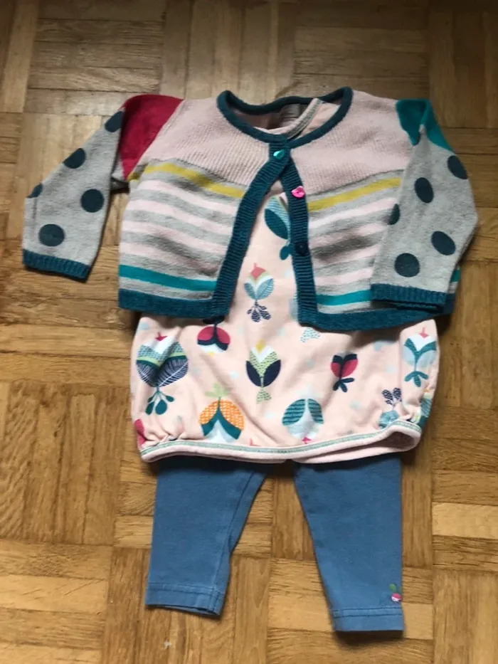 Jolie petit ensemble coordonnée catimini comprenant la robe pressionnée dans le dos pour un habillage facile, le gilet et le petit legging Le tout en taille 3 mois et en parfait état.