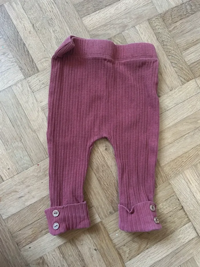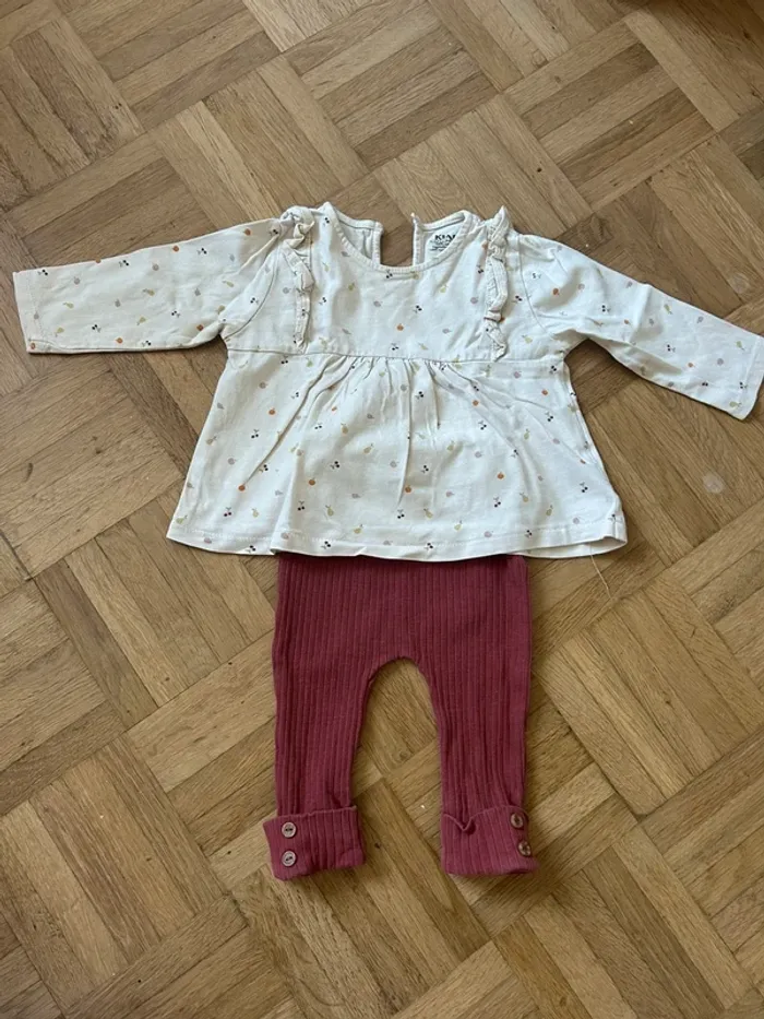 Ensemble composé d’un petit legging côtelé bordeaux et de son haut beige à motif fruités