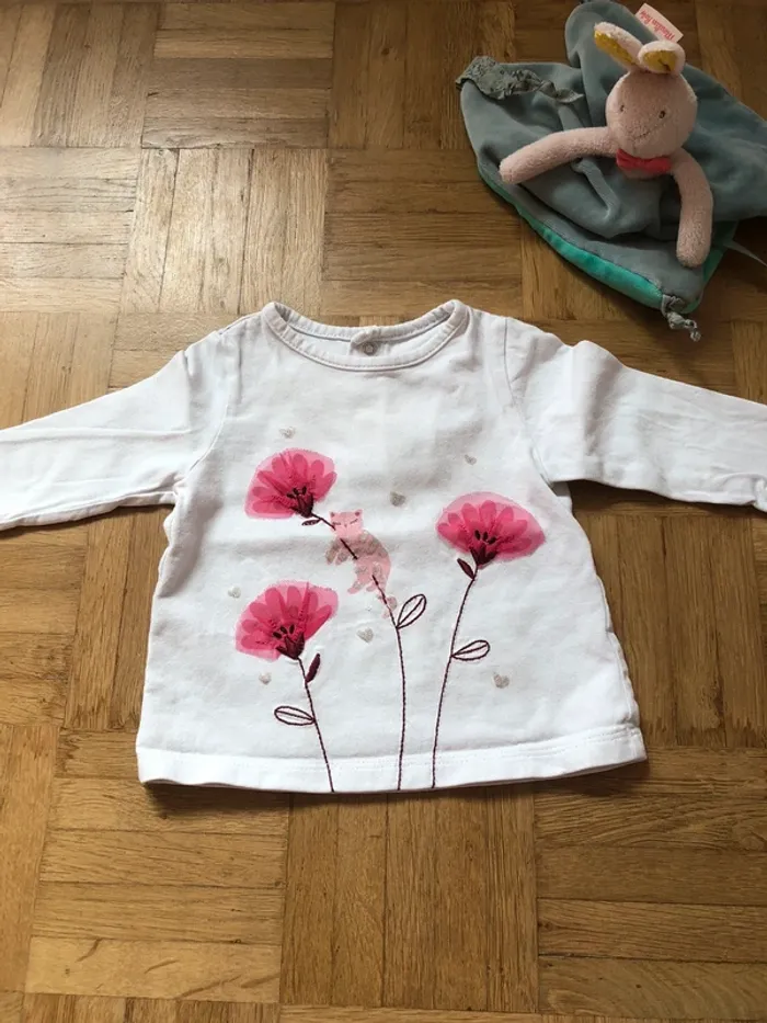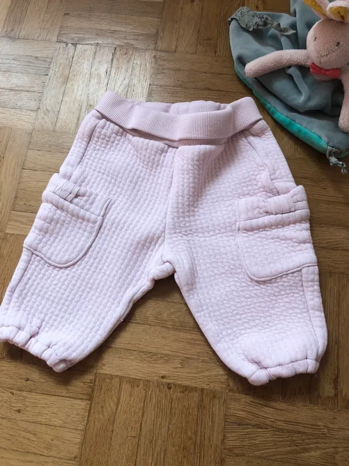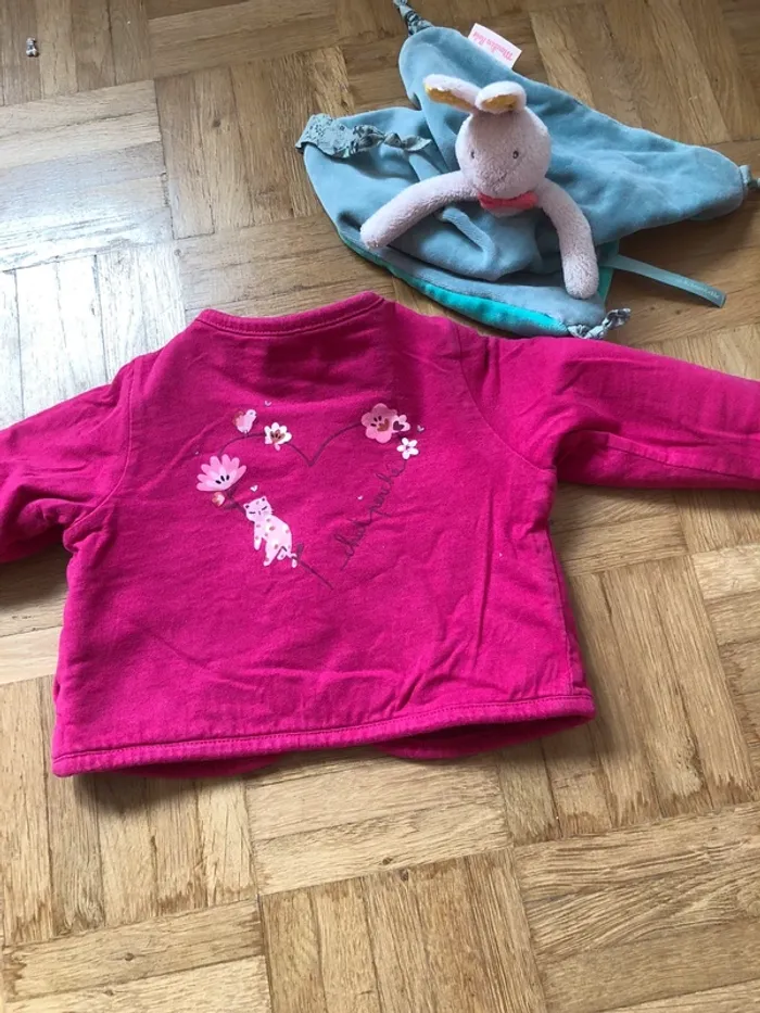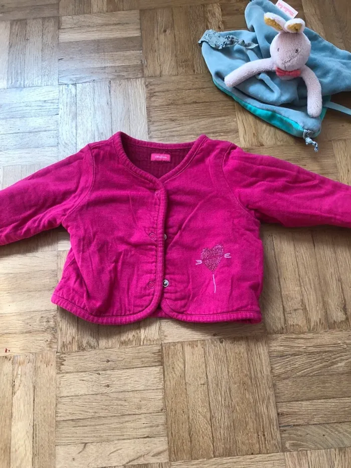 Ensemble catimini : -le t shirt manche longue blanc -le pantalon en coton matelassé rose poudré -le gilet rose fushia réversible, un cote matelassé avec une petite fleure, un cote simple avec motif dans le dos Très bon état