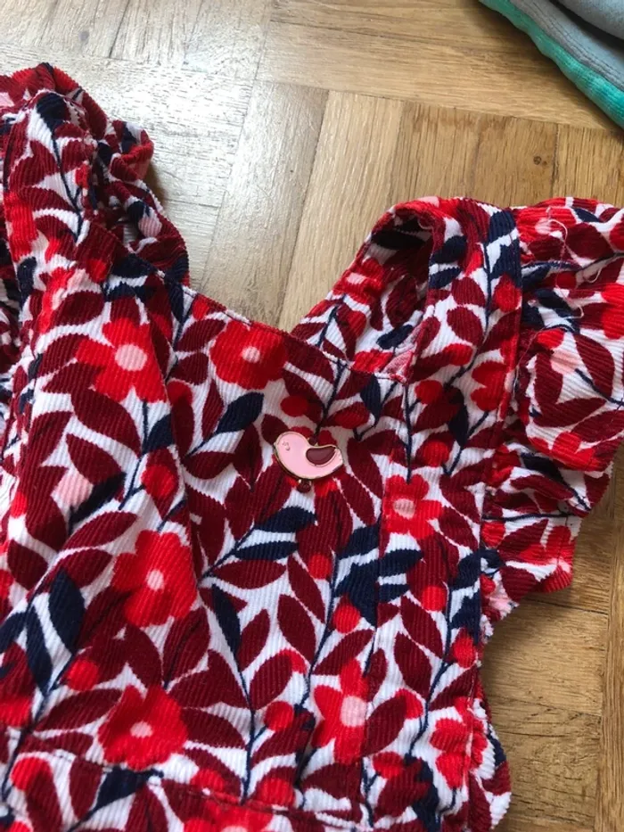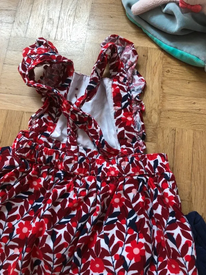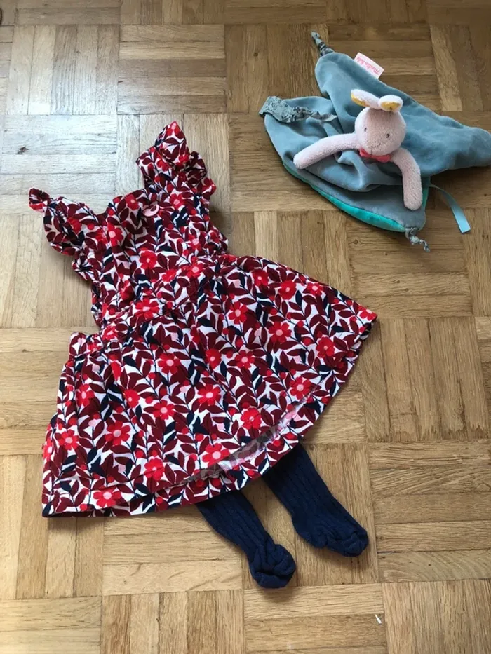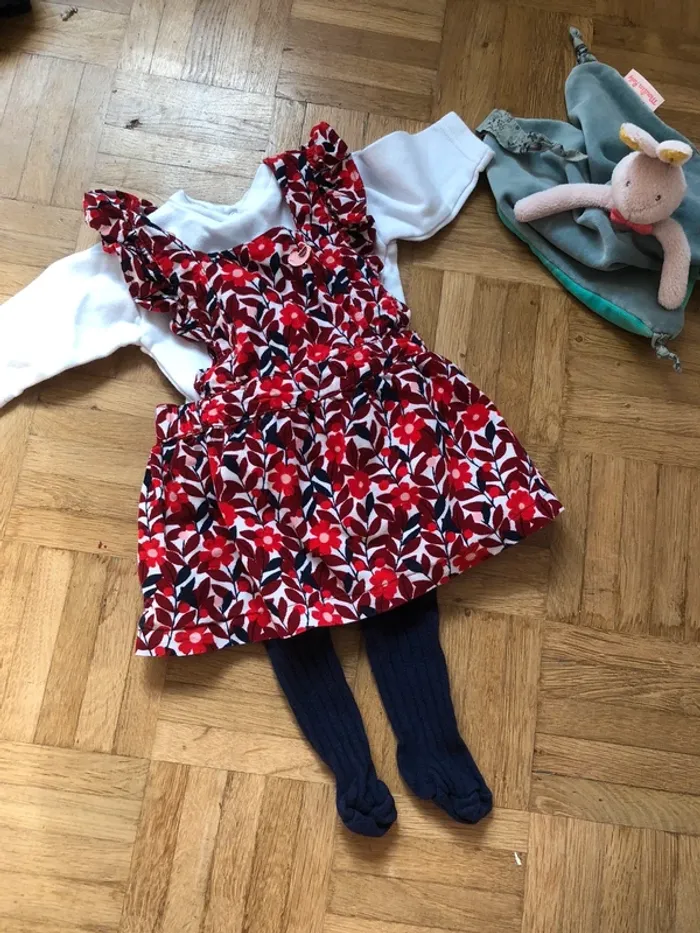 Ensemble sergent major : -robe chasuble en velour côtelé motif liberty (a porte au dessus d’un body ou d’un t shirt blanc par exemple) -les collants en pointure 15-16 (environ 1-3 mois) assortis 3 mois, excellent état Le t shirt blanc n’est pas vendu avec