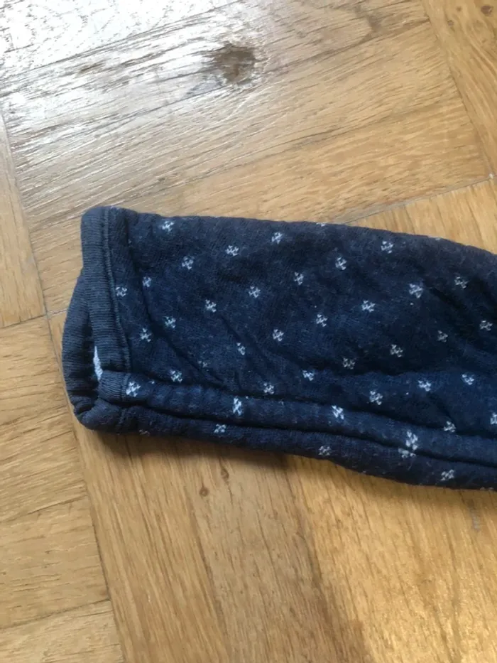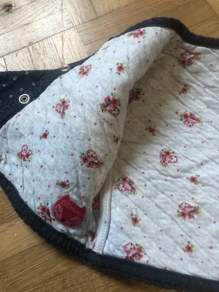 Gilet réversible catimini en taille 3 mois, mais je trouve qu’il taille plutôt petit, conviens à du 1 mois. Les pressions ont un peux perdu leurs couleurs sinon il est en bon état