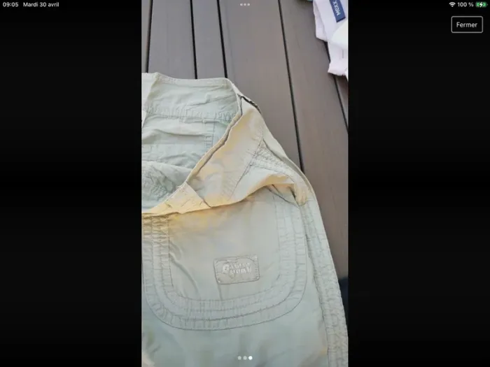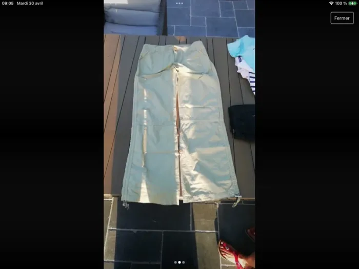 Pantalon banana moon, il peut se raccourcir sur 2 hauteurs grâce à des boutons Étiqueté 42 mais taille plutôt petit (40 plutôt). Longeurs des jambes 103 cm