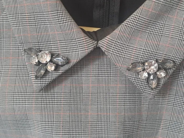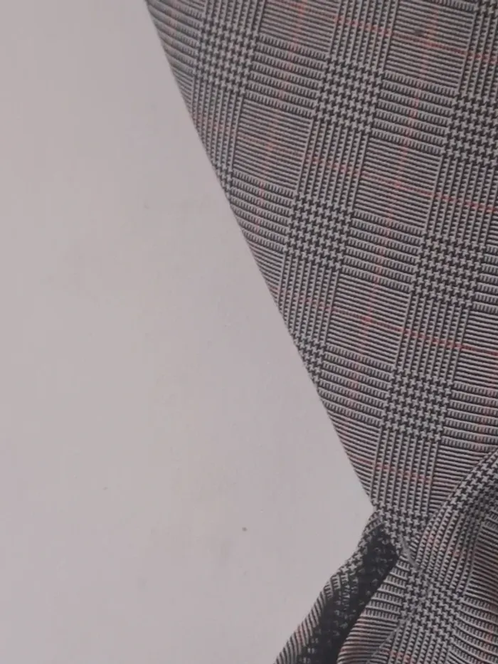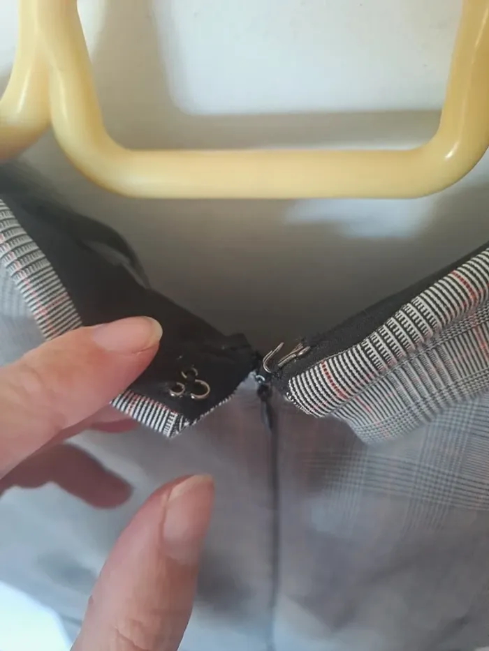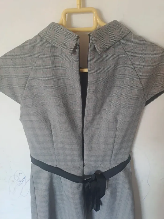 Robe effet tailleur Manches courtes Col avec décor de perle Avec une ceinture Fermeture éclair et crochet à l'arrière Couleur gris à carreaux noir, blanc, rouge Taille M (38) Marque Zara #elodie2429robe #elodie2429femmetaille38 #elodie2429femmezara