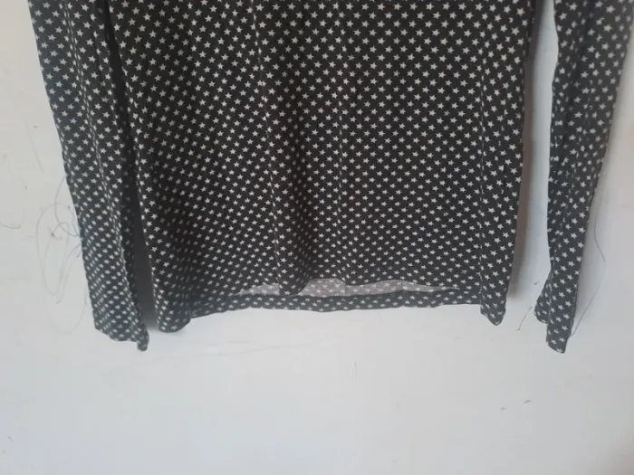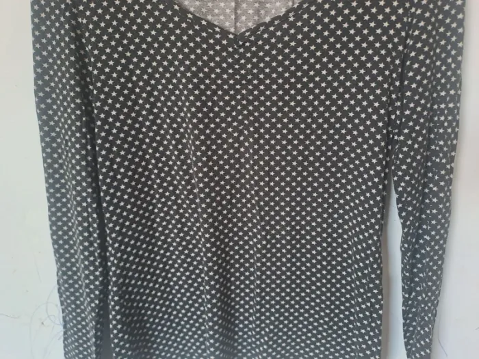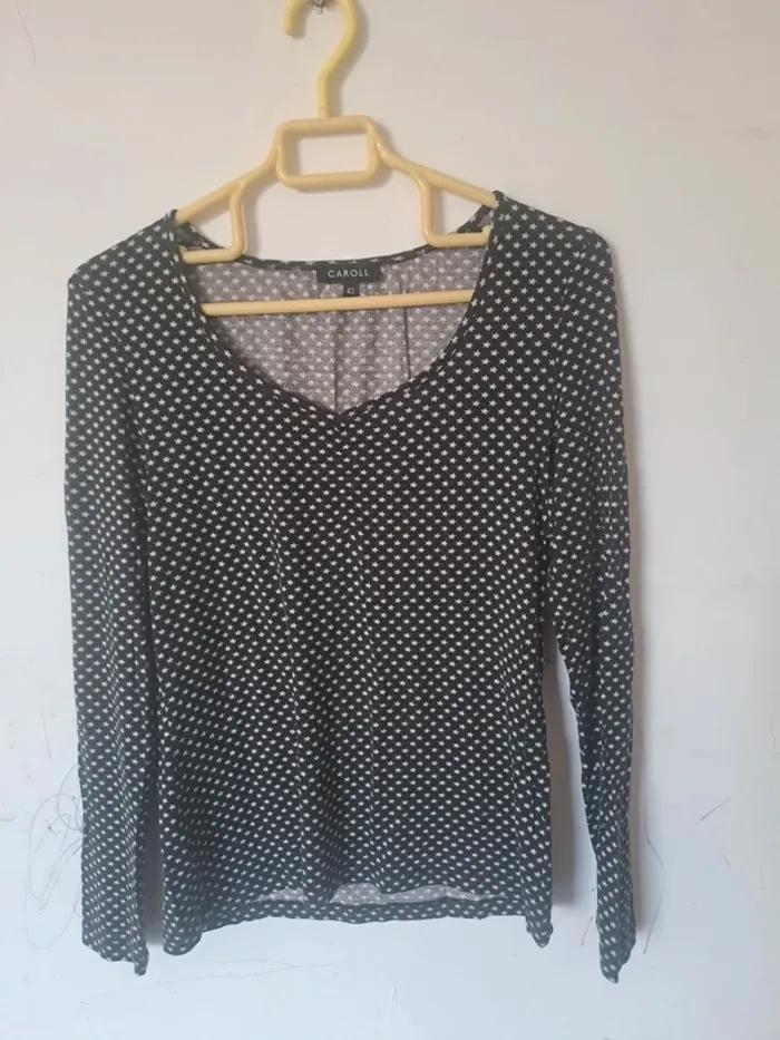 Blouse manches longues Col en rond avec une petite pointe en V Couleur noir à étoiles blanches Taille 42 Marque Caroll #elodie2429femmehaut #elodie2429femmetaille42