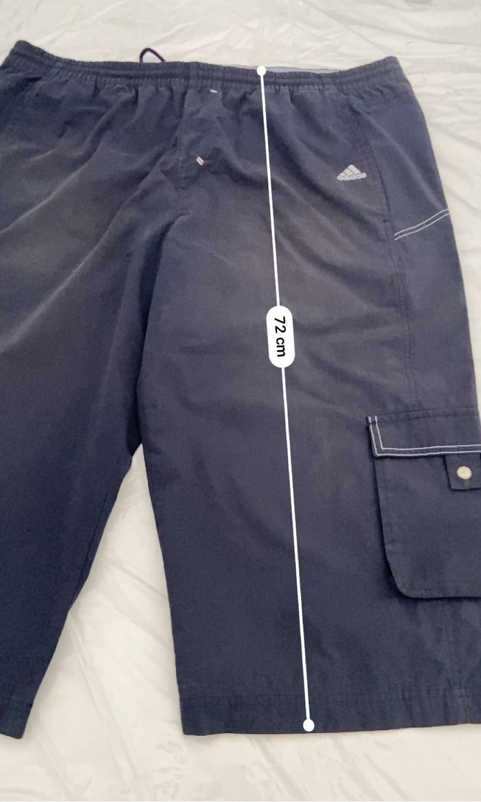 Je vends ce pantacourt Adidas de couleur noire en taille XL. - Type de produit : Pantacourt - Marque : Adidas - Taille : XL - matière : 35% coton 65% polyester - Couleur : Noir - Caractéristiques : Poches latérales, Taille élastiquée - voir les dimensions sur photos