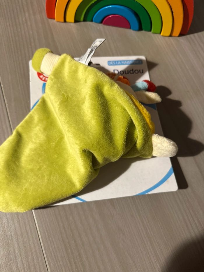 Doudou plat GIRAFE velours jaune et coloré avec dos velours vert